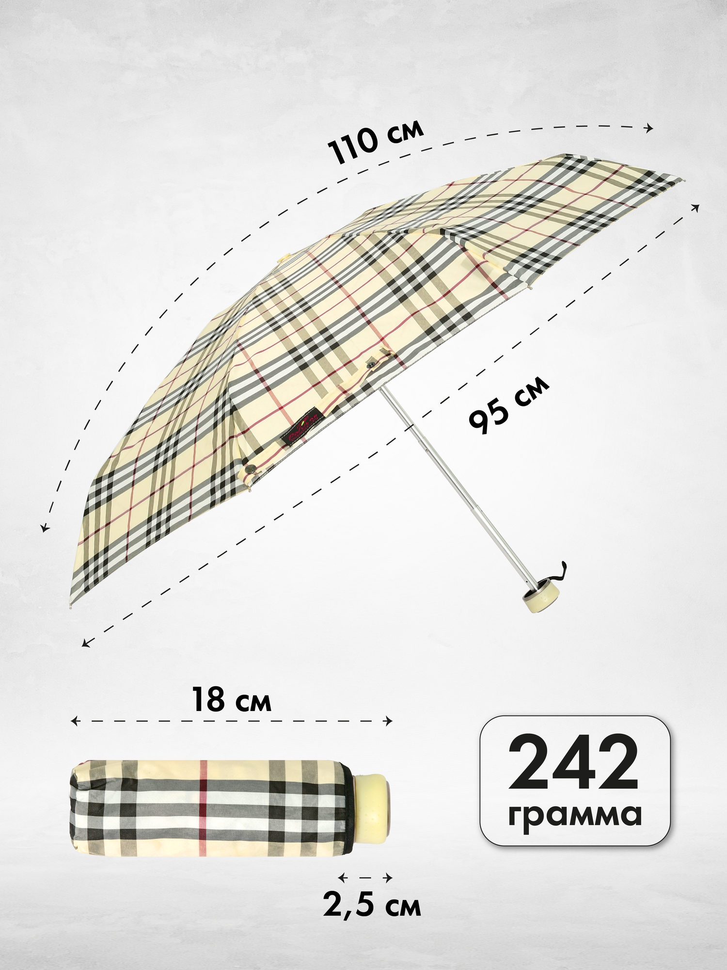 | Дополнительная информация | Комплектация: зонт 1шт, чехол 1шт, прозрачный пакет 1шт. |
