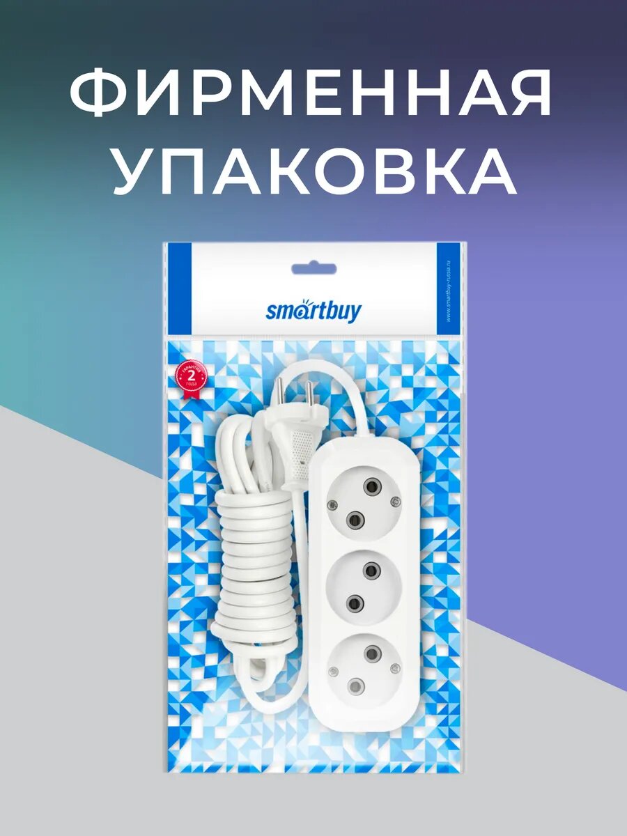 Удлинитель SmartBuy SBE-10-3-02-N/SBE-10-3-03-N/SBE-10-3-05-N, 3 розетки, б/з, 10А / 2200 Вт белый 3 м 3