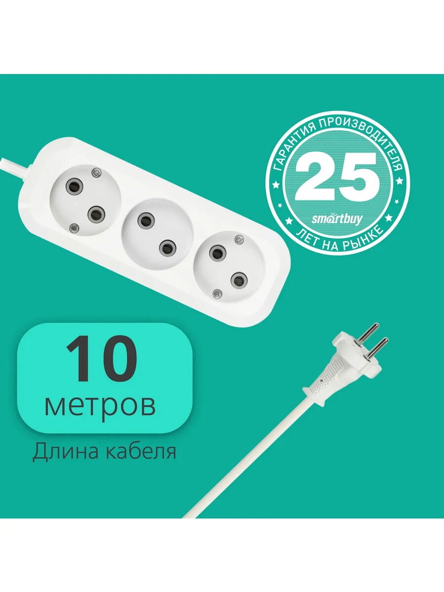 Купить Удлинитель Smartbuy, 3 гнезда 10 метров 10А/2,2кВт без заземления ПВС 2х1,0