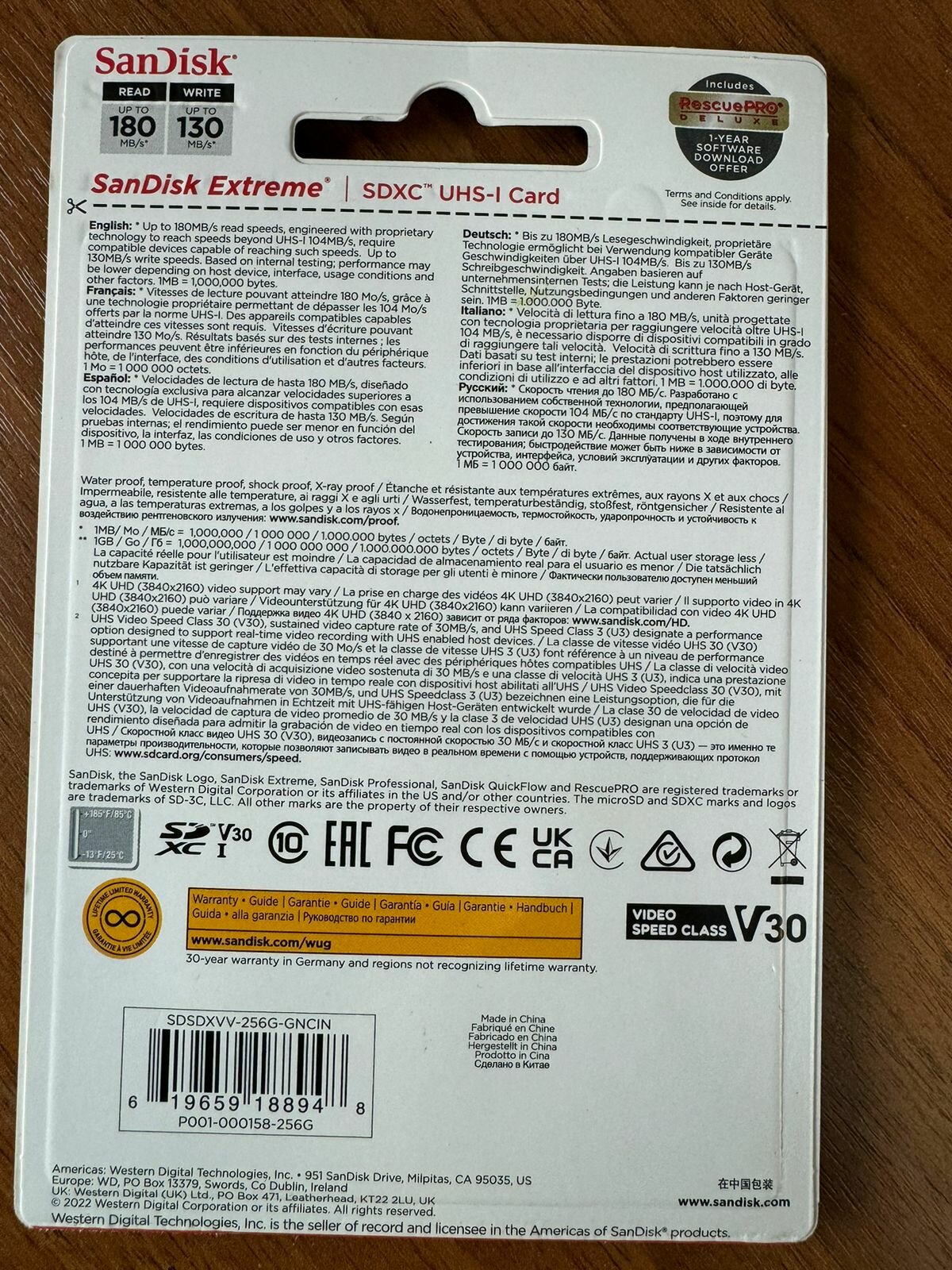 Карта памяти SanDisk Extreme SDXC 256 ГБ Class 10 UHS-I U3 V30 (R/W 180/130 Mb/s)