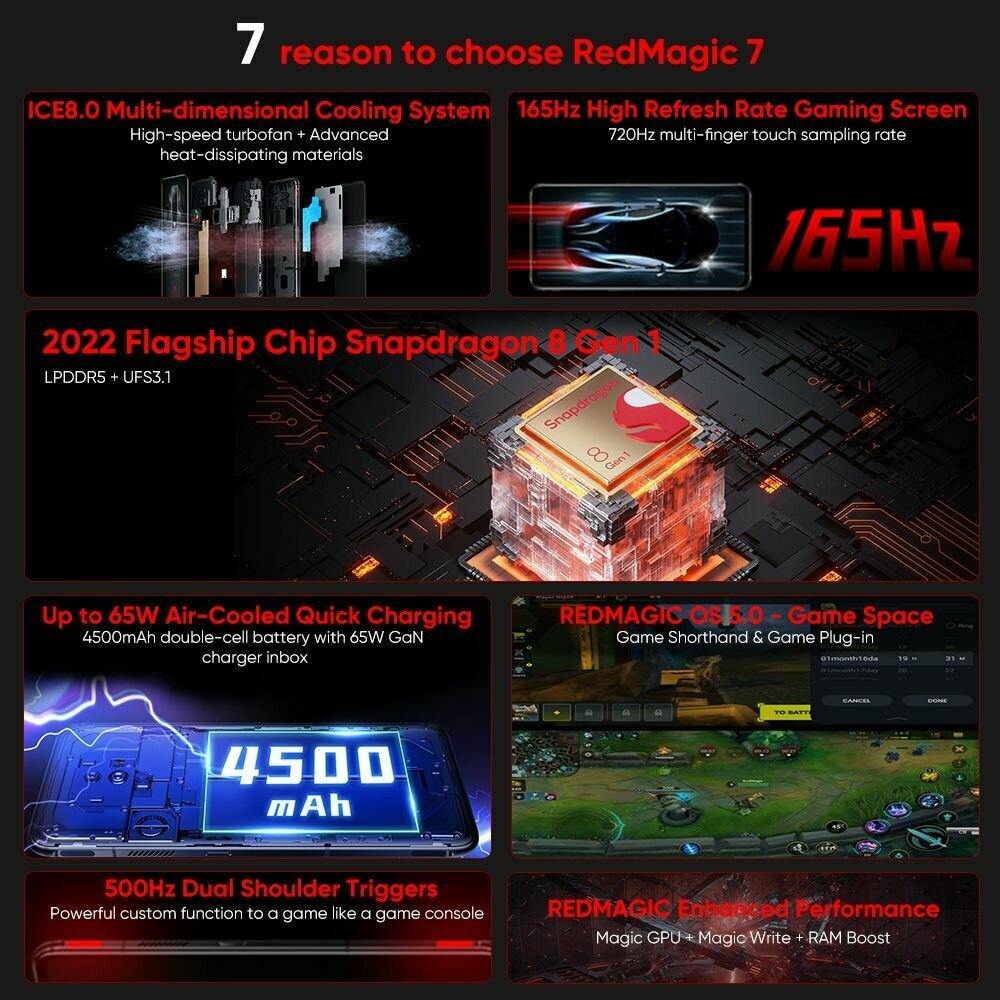 Топовое железо и активное охлаждение к нему. Гиковский игровой дизайн, на который приятно смотреть. Очень быстрая зарядка которая заряжает телефон буквально за 30 минут. Удобные триггеры, играю в diablo immortal. |