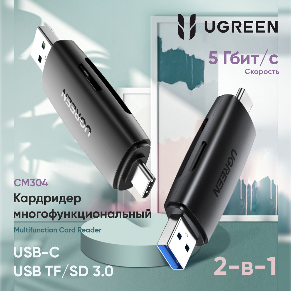 Кардридер многофункциональный UGREEN CM304 (80191) Multifunction USB-C +USB TF/SD 3.0 Card Reader. Цвет: черный интересное: