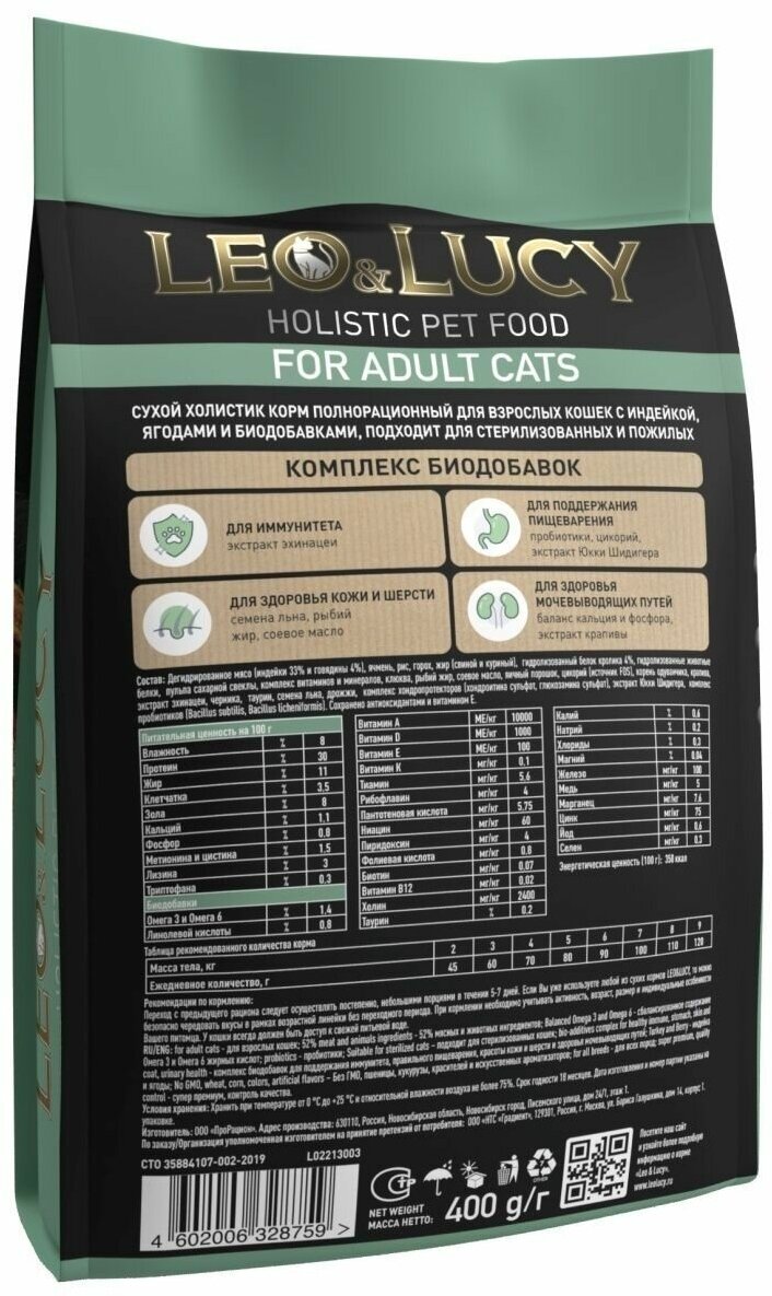 LEO&LUCY cухой холистик корм полнорационный для взрослых кошек с индейкой, ягодами и биодобавками, подходит для стерилизованных и пожилых, 400 г.