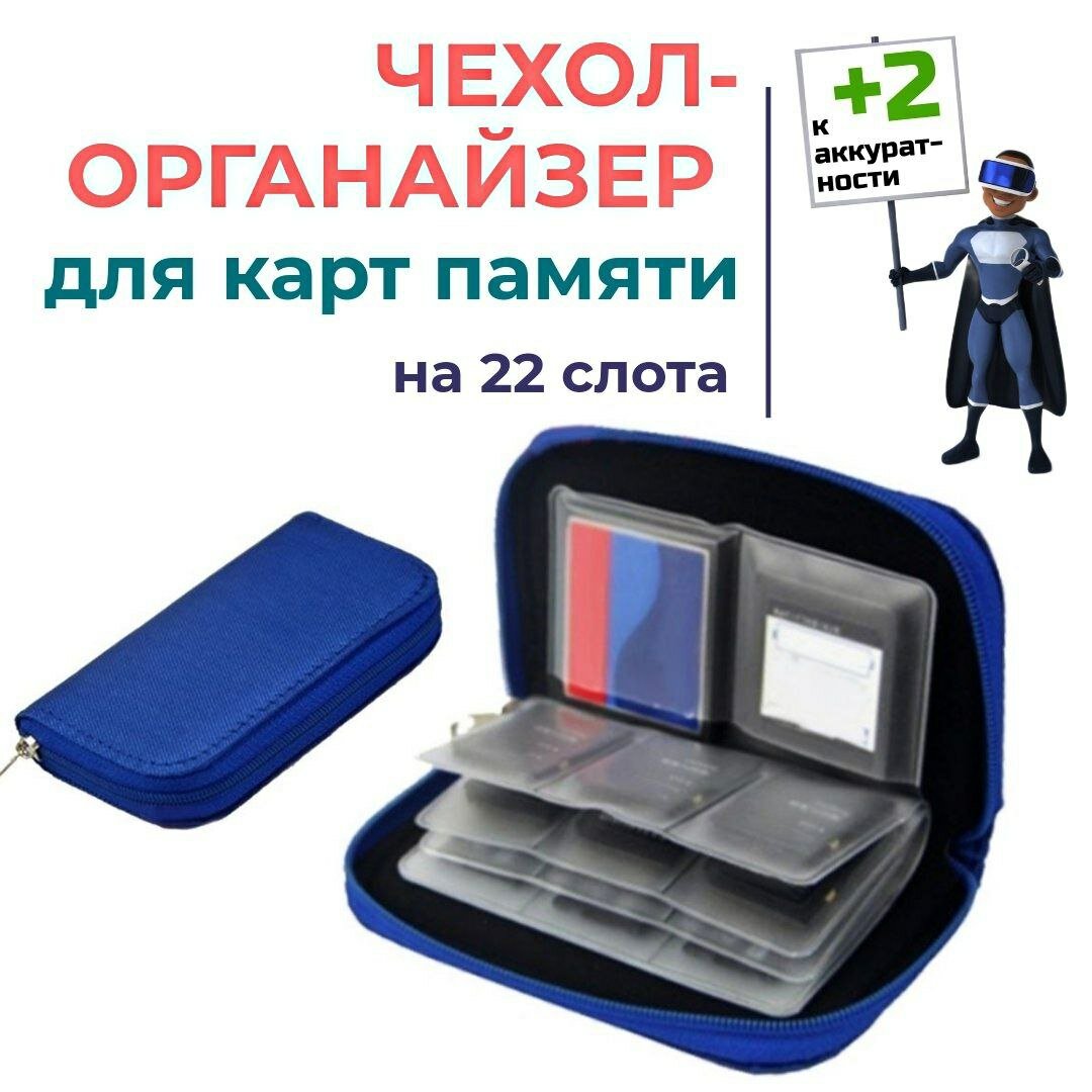 СохранитьОрганайзер для карт памяти, 22 слота. Чехол для мемори карт игровых приставок SD, CF, сим-карт от телефона. Синий интересное:
