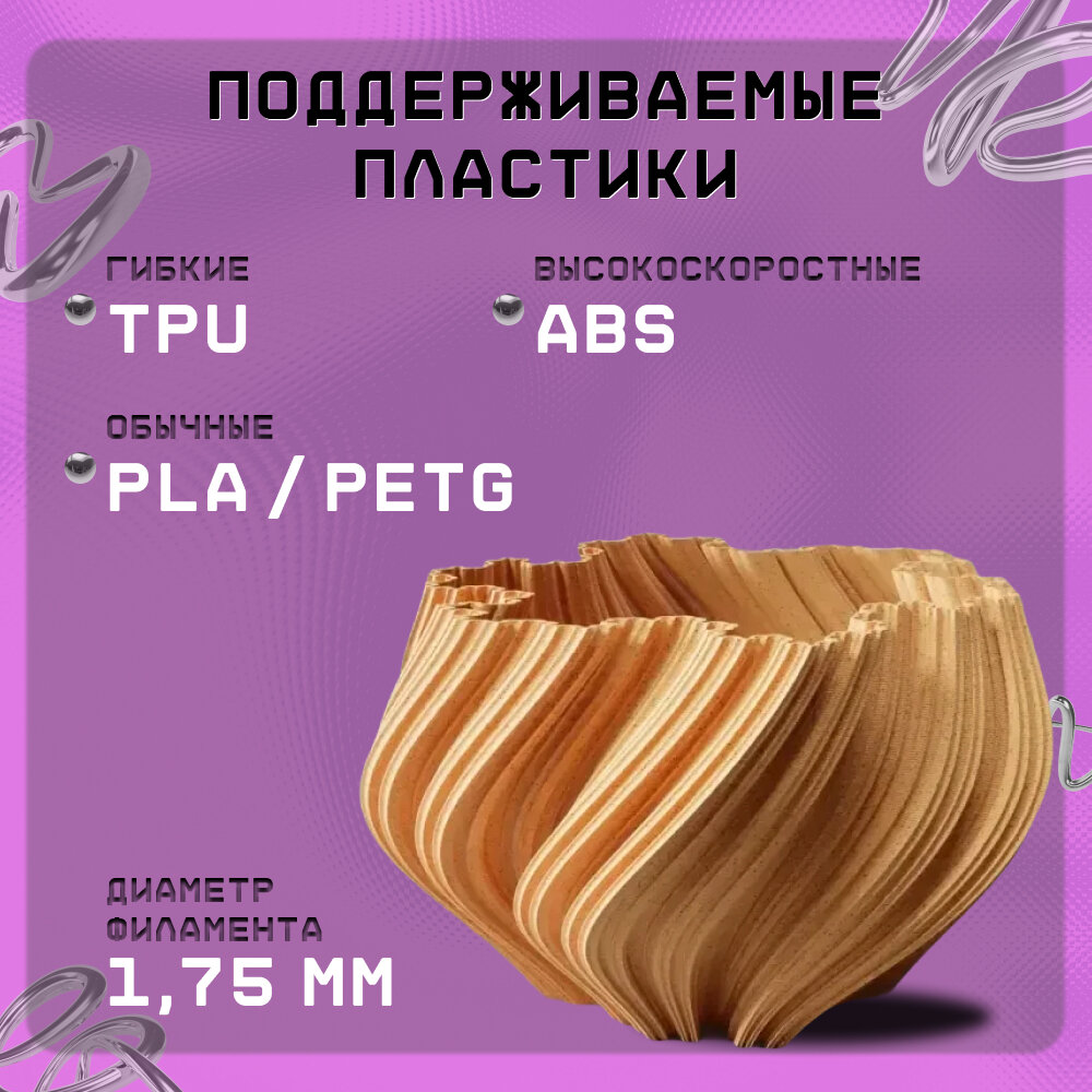 Места много занимает. Хорошо печатает петгом и ПЛА. АБС не пробовал - есть закрытые принтеры. Справился с мягким ТПУ от FDplast |