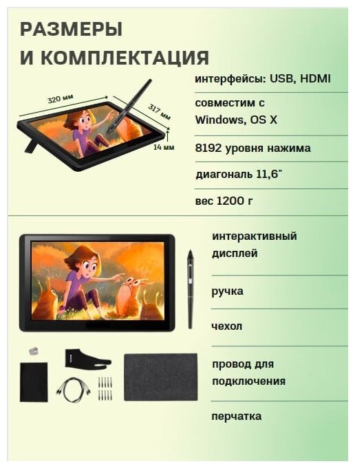 Графический монитор для рисования Mike Store PBMS-12: для Windows/для Mac OS/mini HDMI/Type-C/диагональ 11,6" IPS HD/16,7 млн цветов. интересное: