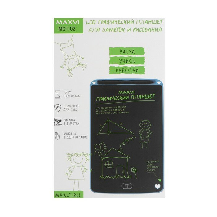 Купить Графический планшет для рисования и заметок LCD Maxvi MGT-02, 10.5”, угол 160°,CR2016, синий