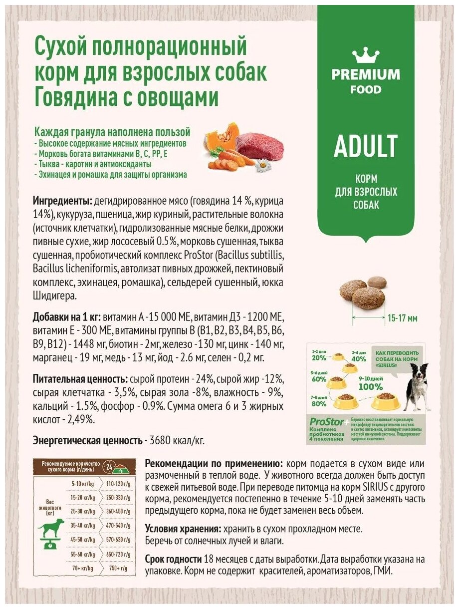 Сухой корм премиум класса SIRIUS для взрослых собак, говядина с овощами, 15 кг
