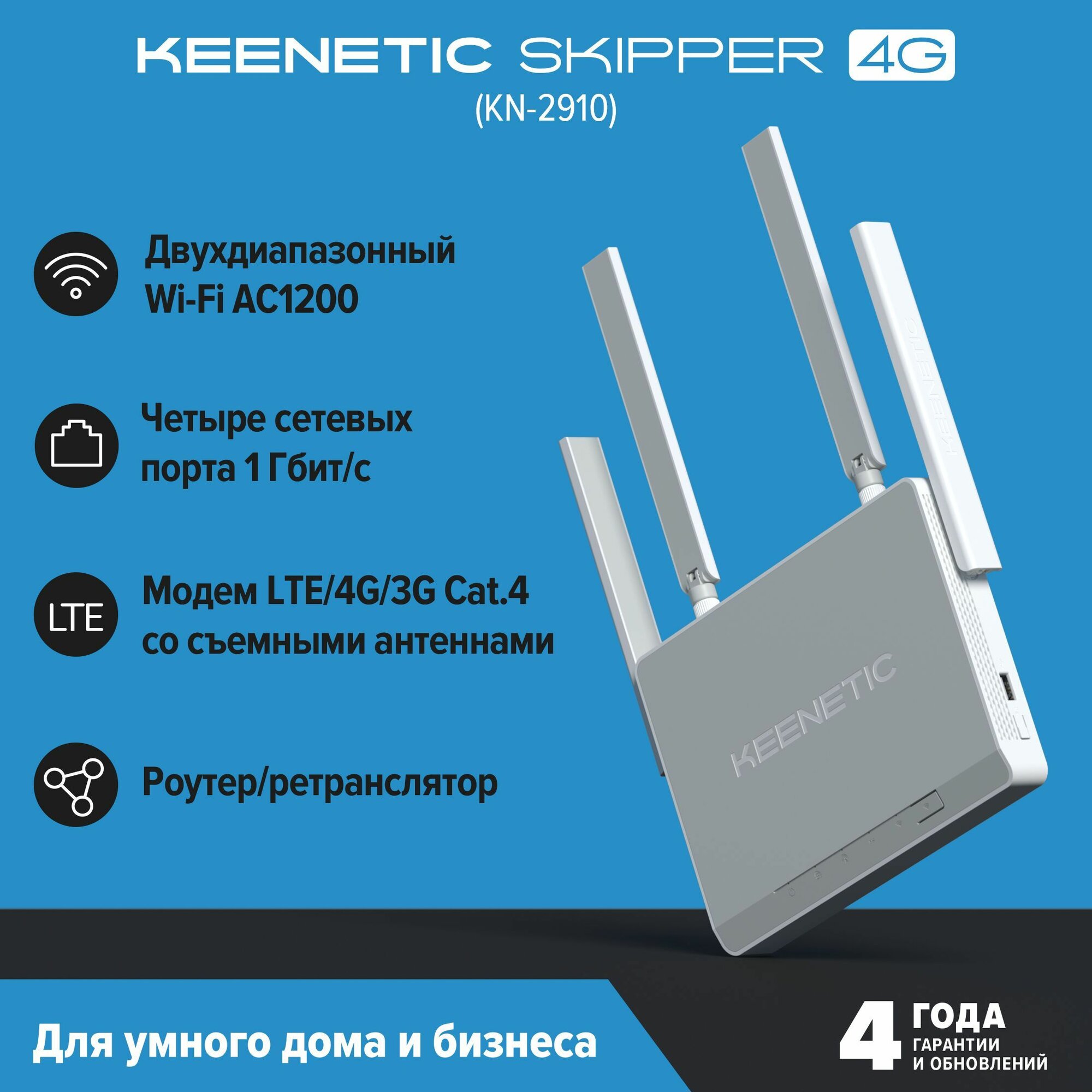 Маршрутизатор KEENETIC Keenetic Skipper 4G (KN-2910) Гигабитный интернет-центр с модемом 4G, Mesh Wi-Fi 5 AС1200, 4-портовым Smart-коммутат