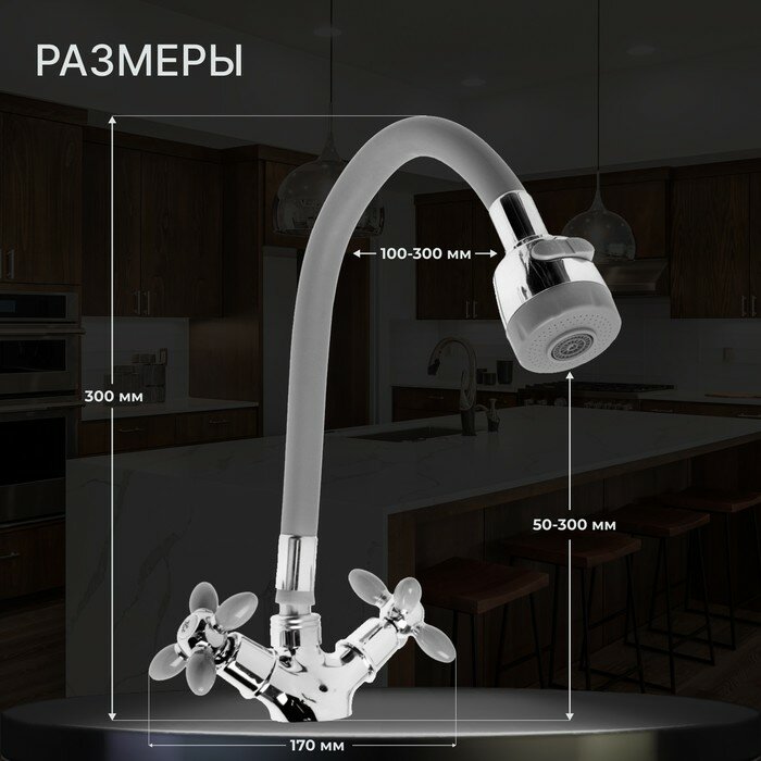 Смеситель для кухни ZEIN ZC2030, гибкий силикон излив, кран-букса латунь 1/2", серый/хром 7610319