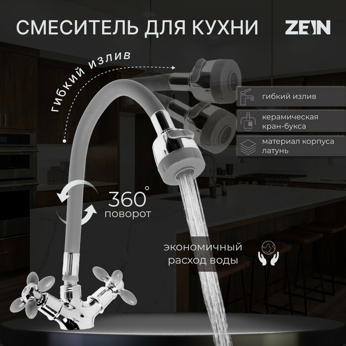 Купить Смеситель для кухни Zein Zc2030, гибкий силикон излив, кран-букса латунь 1/2", серый/хром Zein 76103 .