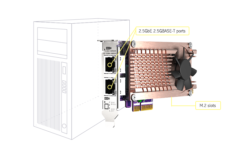 QNAP QM2-2P2G2T Expansion card 2 slots M.2 2280 NVMe. PCIe Gen3 x4 interface, 2x 2.5 GbE BASE-T. интересное: