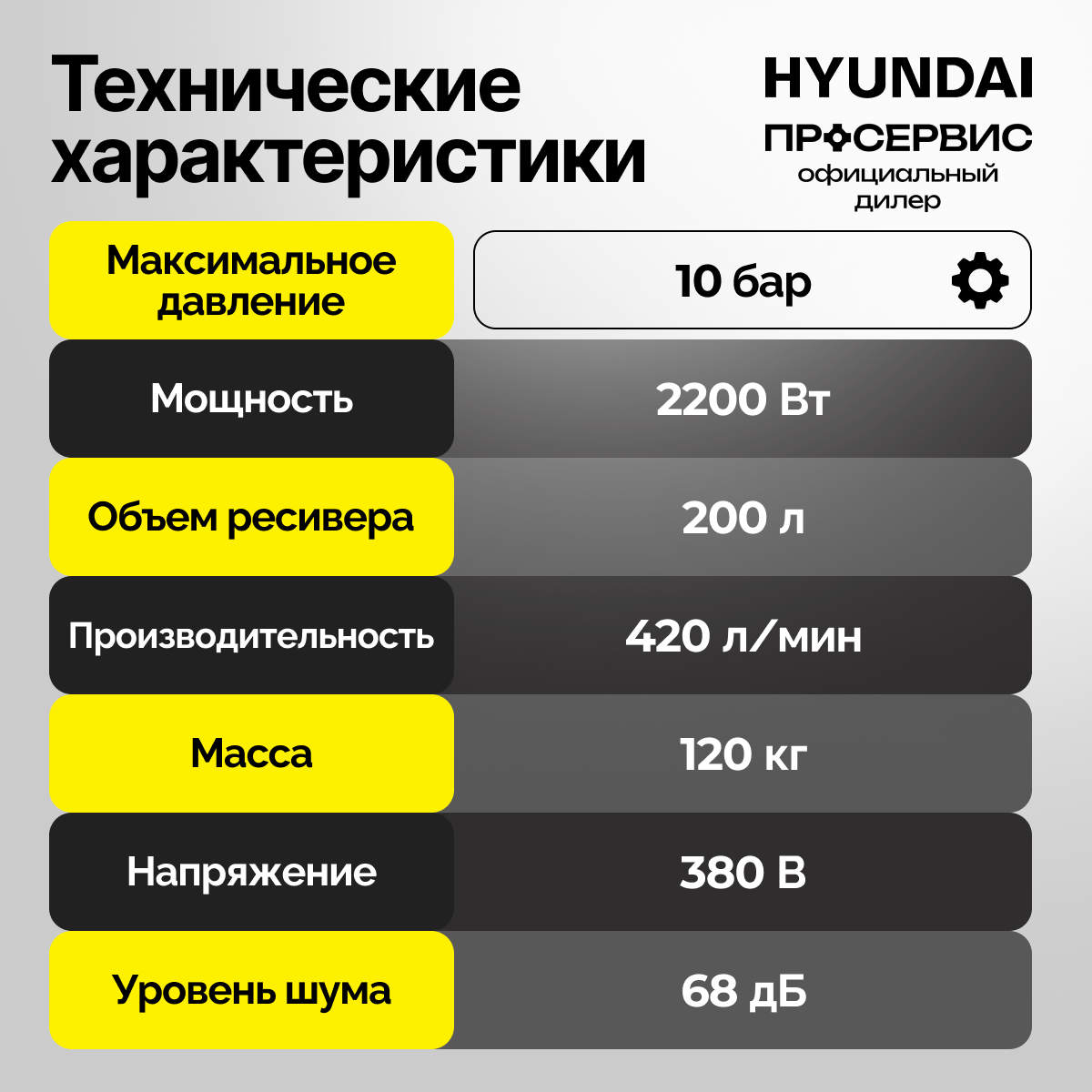 Компрессор воздушный масляный Hyundai HYC 40200-3BD 200 л, 420 л/мин, для пневмоинструмента, продувочной техники, накачки колес, для покраски