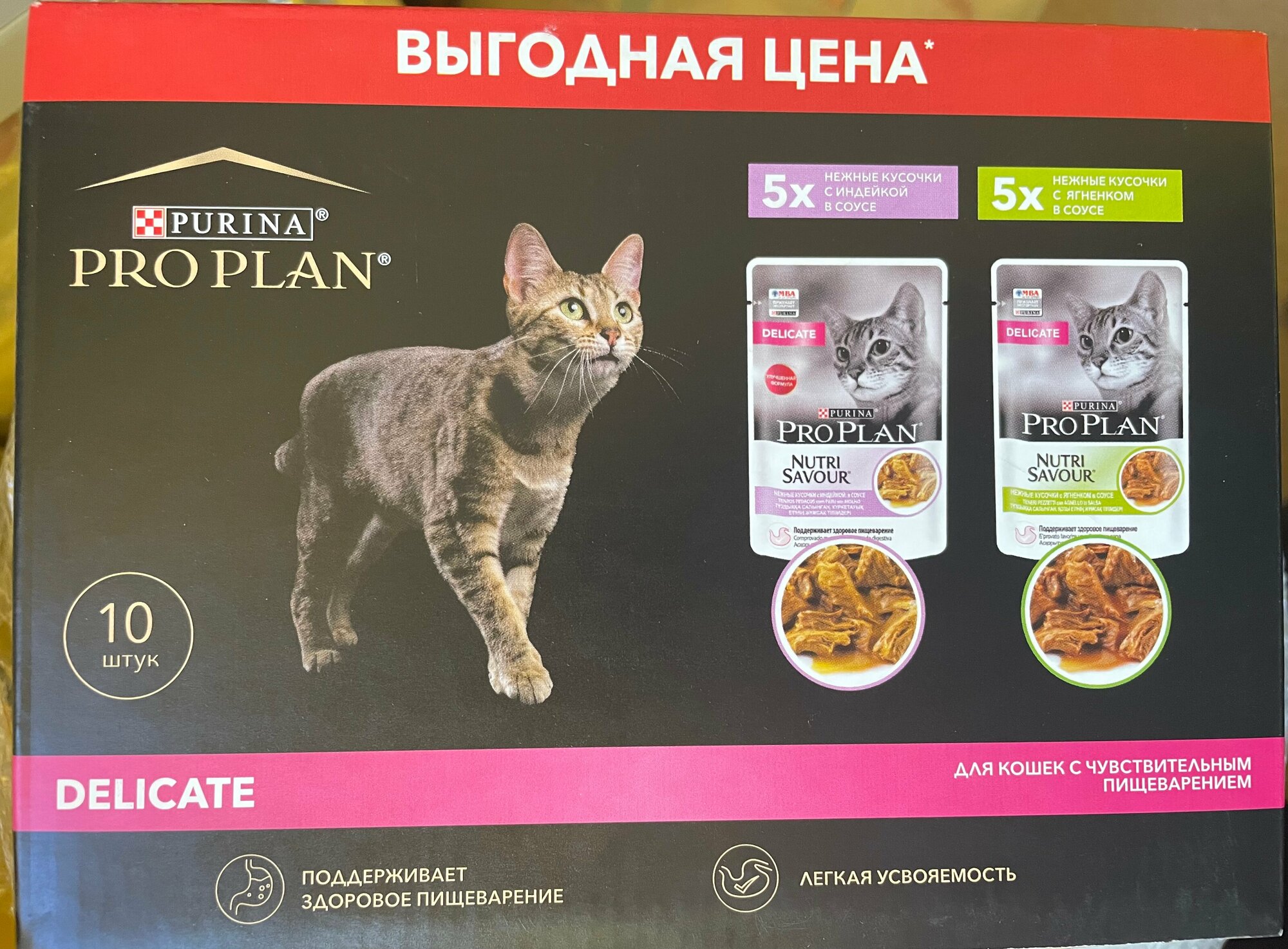 Корм PRO PLAN Delicate (в соусе) для кошек с чувствительным пищеварением или с особыми предпочтениями в еде, с индейкой и с ягненком, 850 г (85 г х 10 шт)