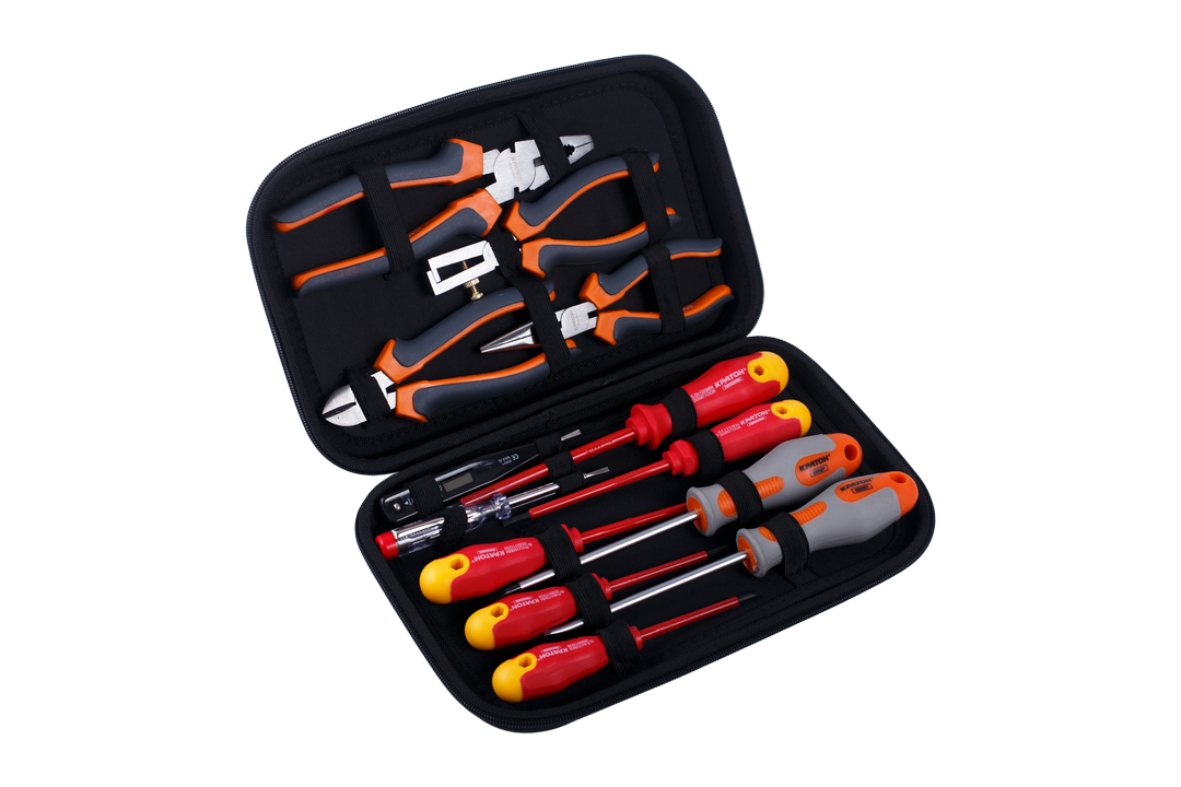 | Ручной инструмент подробно | Отвертки - 7шт.; 2 отвертки - тестера; Пассатижы; Бокорезы; Тонкогубцы; Щипцы для снятия изоляции; Сумка. |