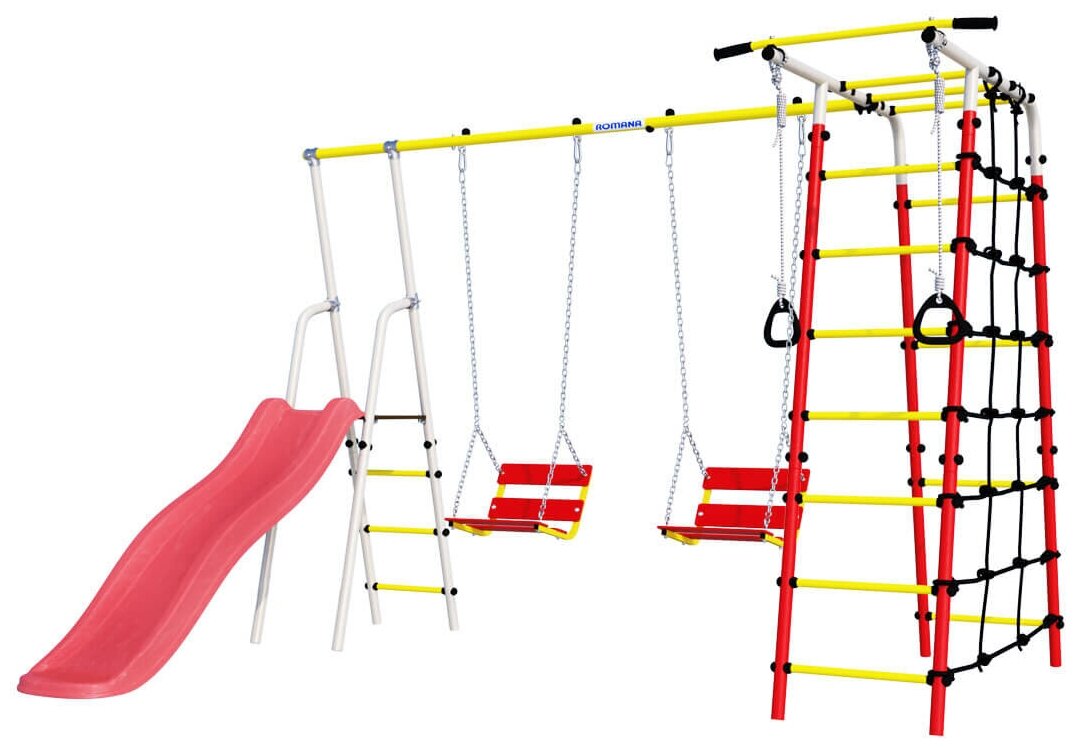 | Комплектация | лестница металлическая двойная П-образная с рукоходом, сетка для лазания, турник неподвижный, горка пластиковая, кольца гимнастические, качели цепные |