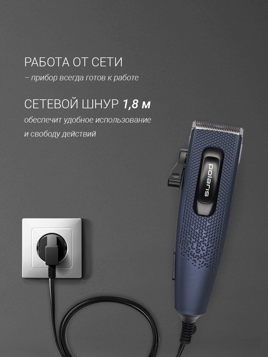 Машинка для стрижки волос POLARIS PHC 0954, 10 установок длины, 4 насадки, от сети, синяя, 34783