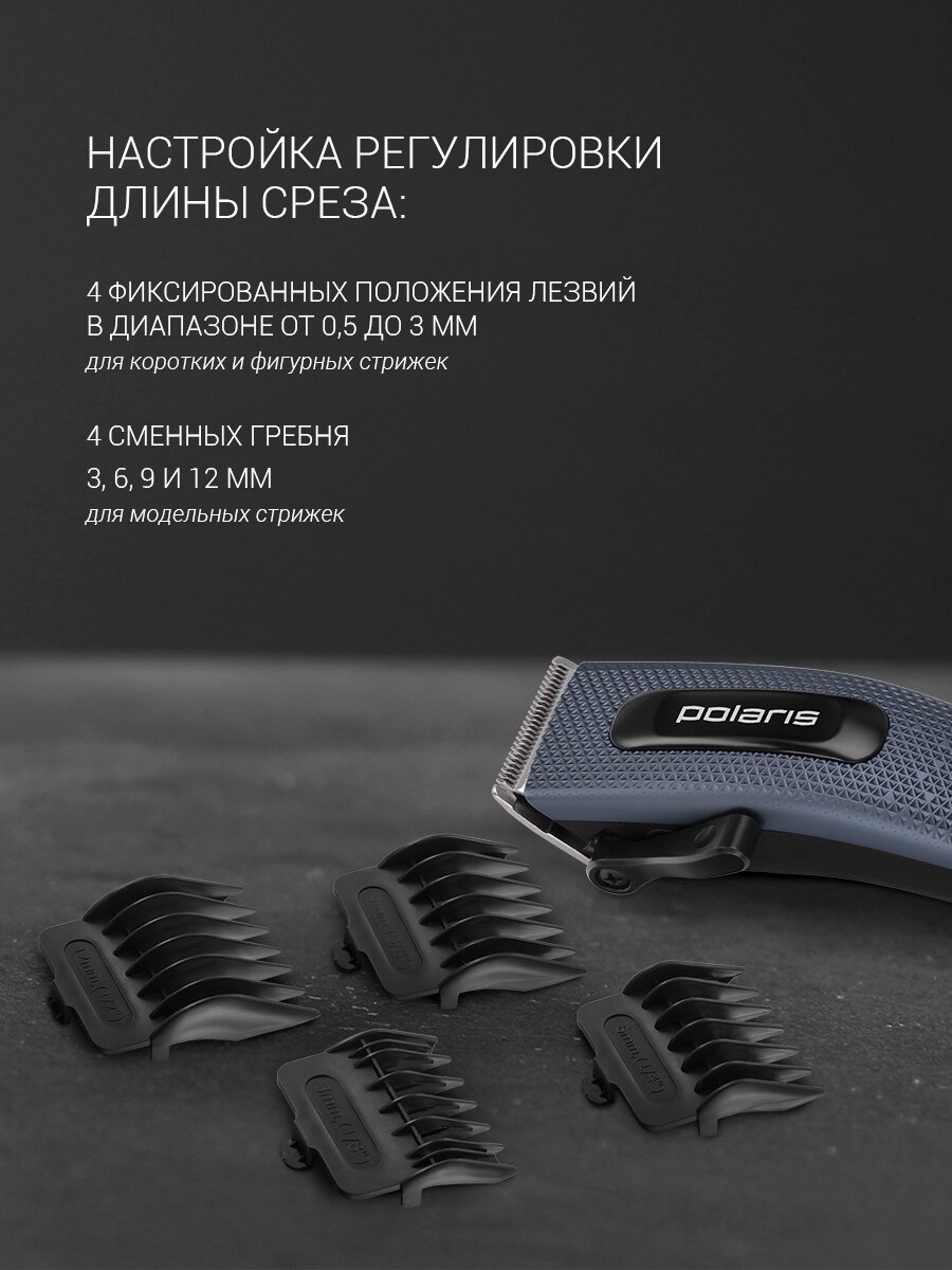 Машинка для стрижки волос Polaris PHC 0954, 4 сменные насадки, синий