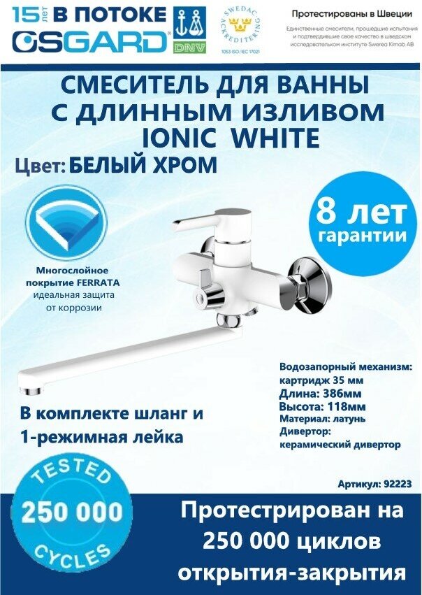 Смеситель для ванны с длинным изливом и гарнитуром OSGARD IONIC WHITE 92223