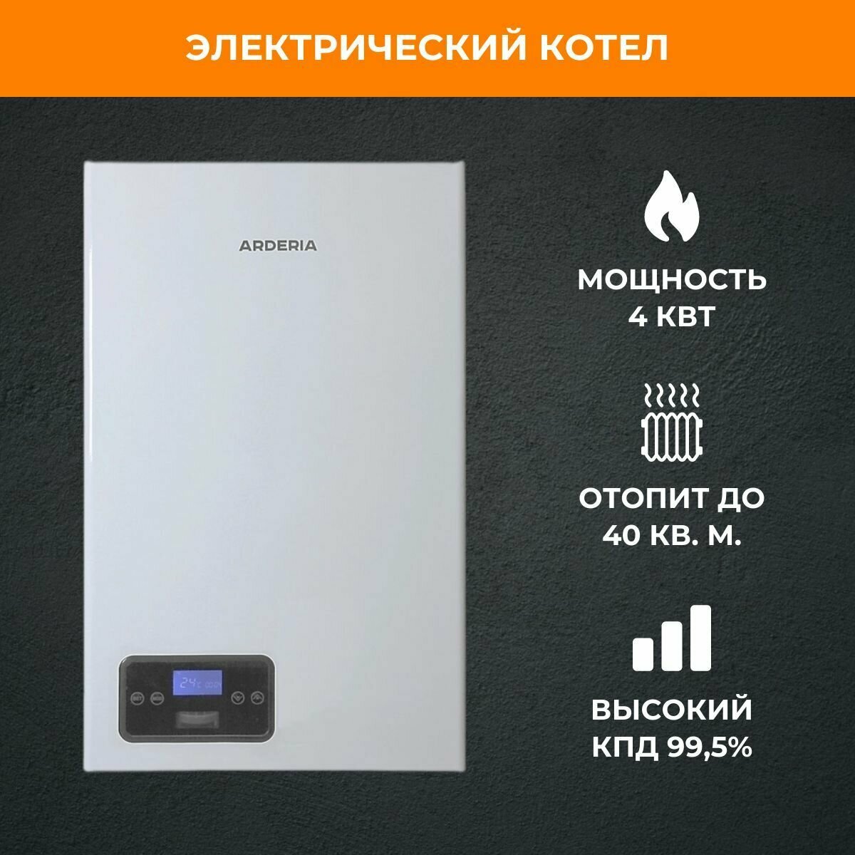 Электрический котел Arderia E4, с возможностью подключения бойлера / одноконтурный / для отопления / сухой тэн / семисторная защита / Ардерия