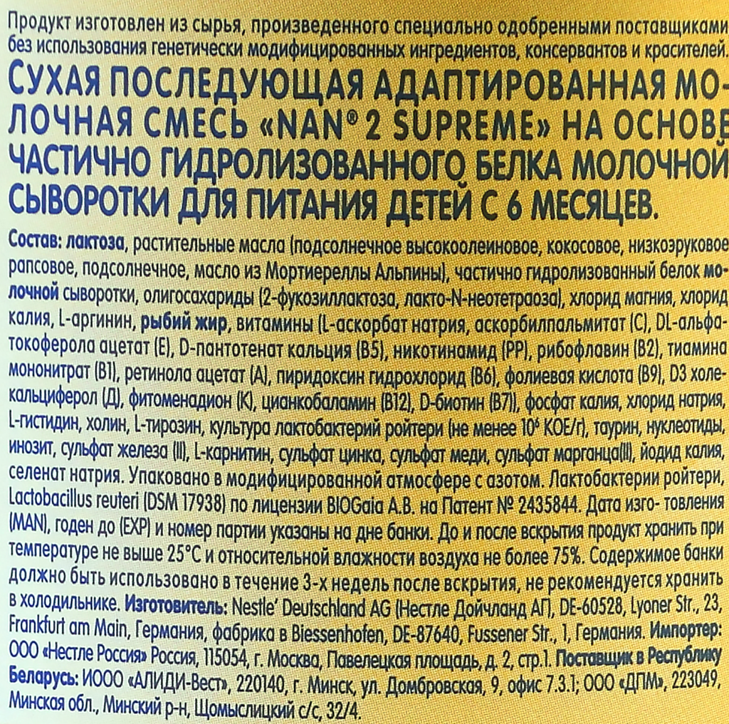 | Состав | лактоза, растительные масла (подсолнечное высокоолеиновое, кокосовое, низкоэруковое рапсовое, подсолнечное, масло из Мортиереллы Альпины), частично гидролизованный белок молочной сыворотки, олигосахариды (2-фукозиллактоза, лакто-N-неотетраза), хлорид магния, хлорид калия, L-аргинин, рыбий жир, витамины (L-аскорбат натрия, аскорбилпальмитат (С), DL-альфа-токоферола ацетат (Е), D-пантотенат кальция (В5), никотинамид (РР), рибофлавин (В2), тиамина мононитрат (В1), ретинола ацетат (А), пиридоксин гидрохлорид (В6), фолиевая кислота (В9), D3 холекальциферол (Д), фитоменадион (К), цианкобаламин (В12), D-биотин (В7)), фосфат калия, хлорид натрия, L-гистидин, холин, L-тирозин, культура лактобактерий ройтери (не менее 10^6 КОЕ/г), таурин, нуклеотиды, инозит, сульфат железа (II), L-карнитин, сульфат цинка, сульфат меди, сульфат марганца (II), йодид калия, селенат натрия |