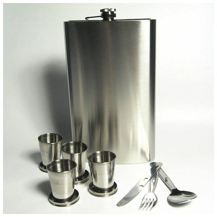 | Дополнительная информация | Объём фляги: 1800 мл., Объём стаканчиков: 70 мл., Размер фляжки: 28 х 18 х 4 см., Длина ложки и вилки: 17 см; подробная комплектация: Фляга - 1 шт., Складные стаканчики - 4 шт., Вилка - 1 шт., Нож - 1 шт., Ложка - 1 шт., Сумка-чехол - 1 шт. |