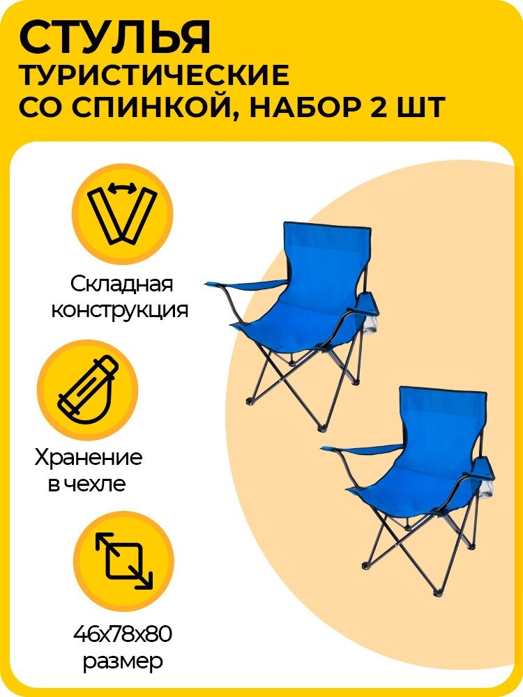 Комплект стульев, складные туристические со спинкой, кресла с подлокотниками и подстаканником, для кемпинга и рыбалки, синие, 2 шт