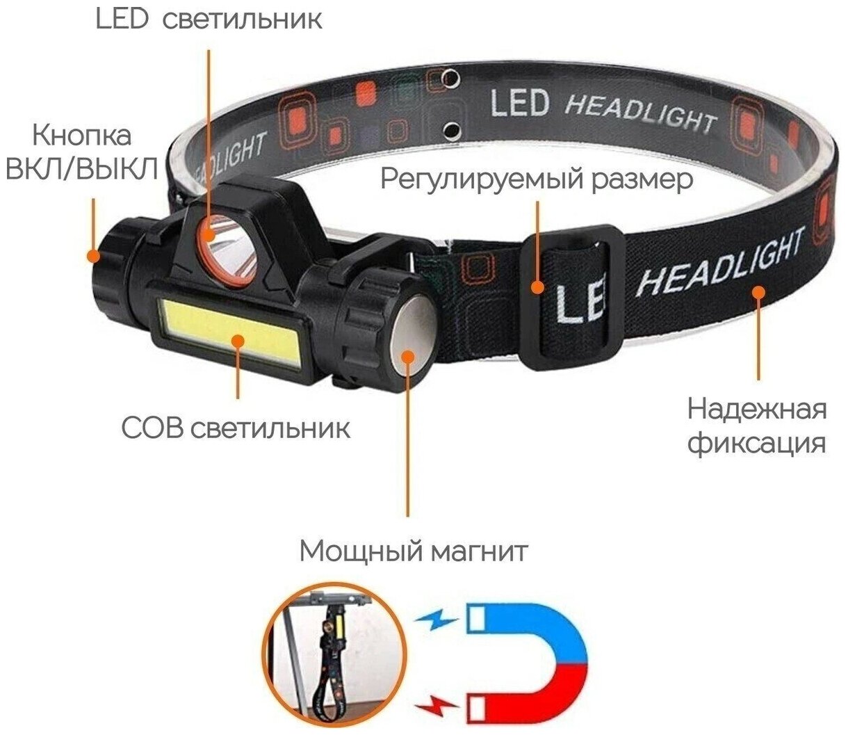 Налобный светодиодный фонарь с магнитом, регулировкой угла свечения и диммированием