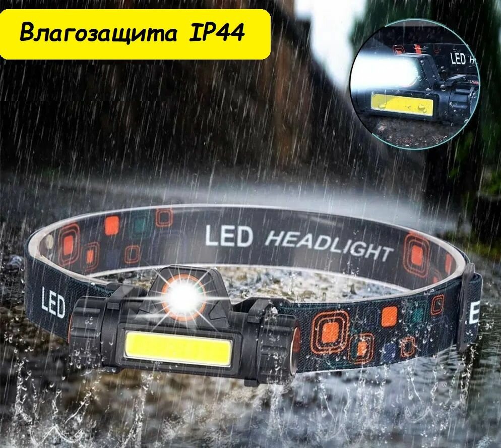Налобный светодиодный фонарь-лента с регулировкой угла свечения, 5 режимов, cо встроенным аккумулятором и зарядом от USB, кабель USB и АКБ в комплекте.