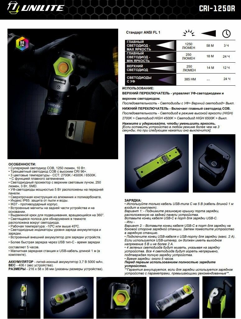 Инспекционный фонарь CRI 96 + 1250 Lm 3 цвета + УФ 5000mAh UNILITE CRI-1250R интересное: