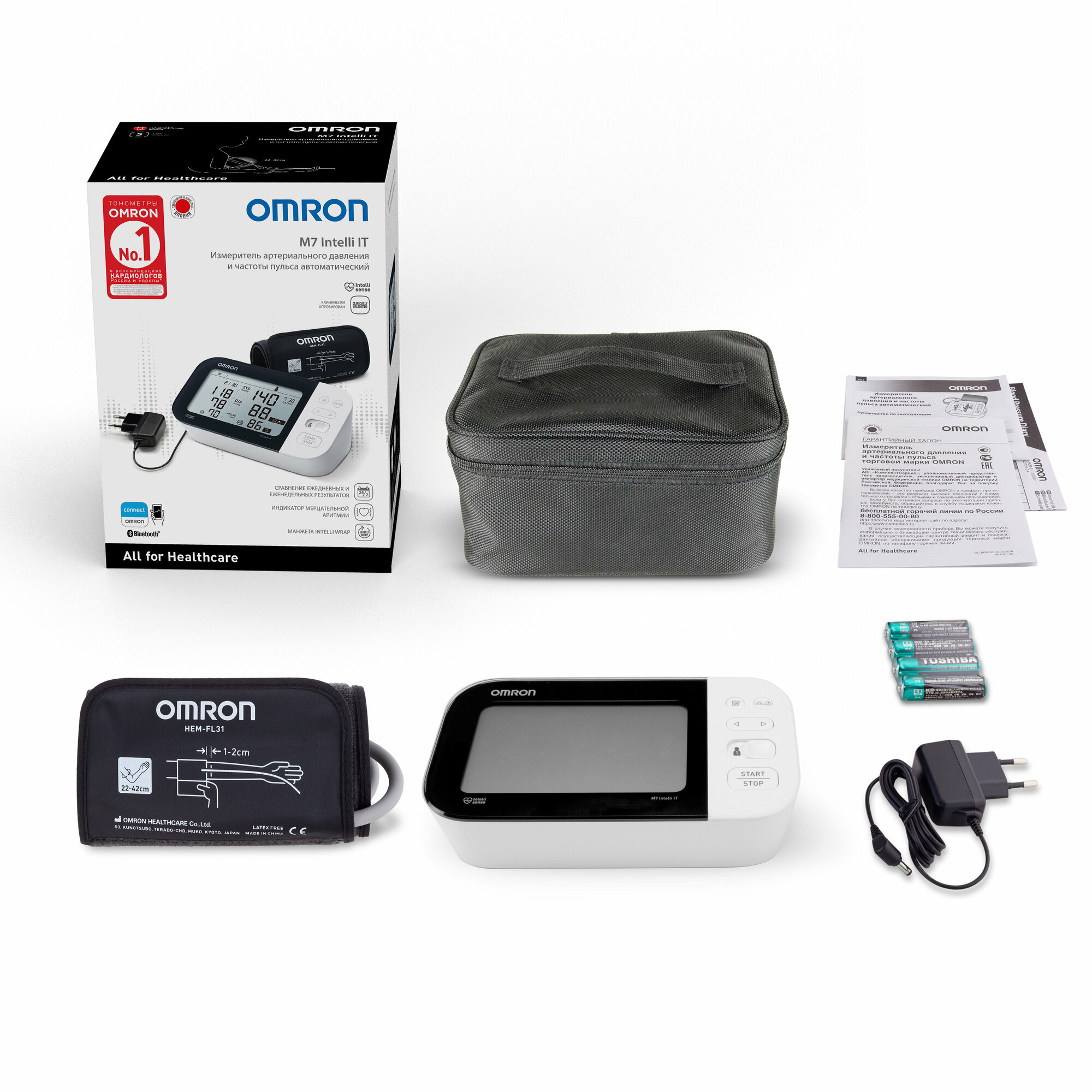 | Комплектация | Электронный блок, манжета компрессионная HEM-FL31, адаптер переменного тока HHP-CM01, элементы питания типа «АА», 4 шт., чехол для хранения прибора, руководство по эксплуатации, инструкция по установке приложения, гарантийный талон, журнал для записи артериального давления |