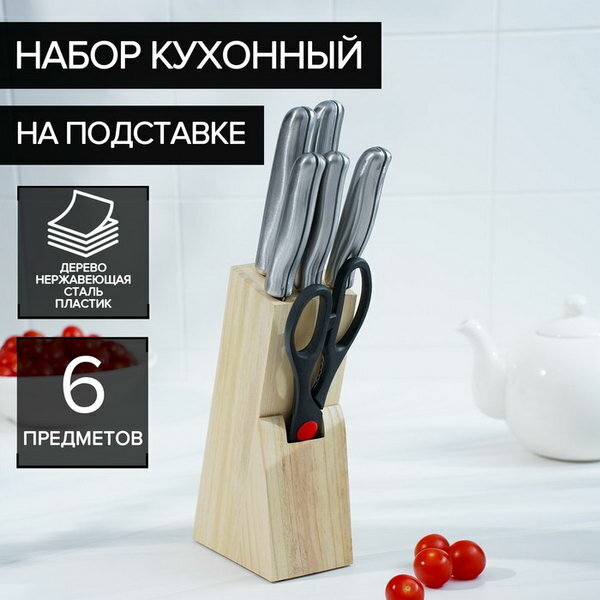 Набор ножей кухонных на подставке «Блеск стали», 6 предметов: 5 ножей лезвие 9,5 см, 13 см, 13,5 см, 20,5 см, 20,5 см, ножницы