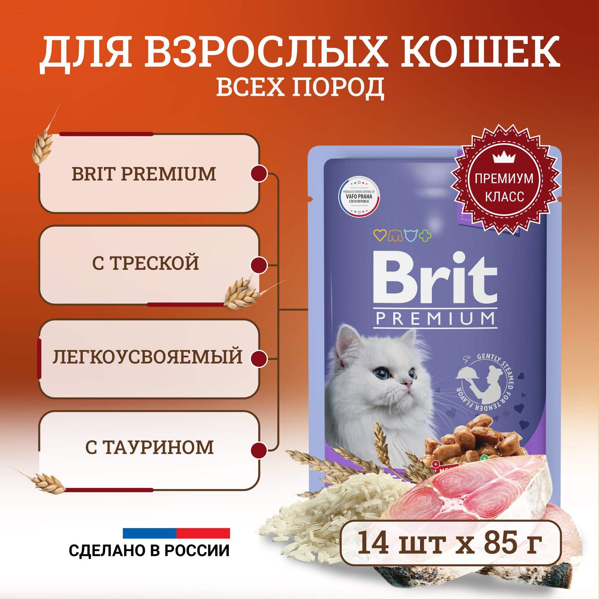 BRIT PREMIUM для взрослых кошек c треской в желе (85 гр х 14 шт)