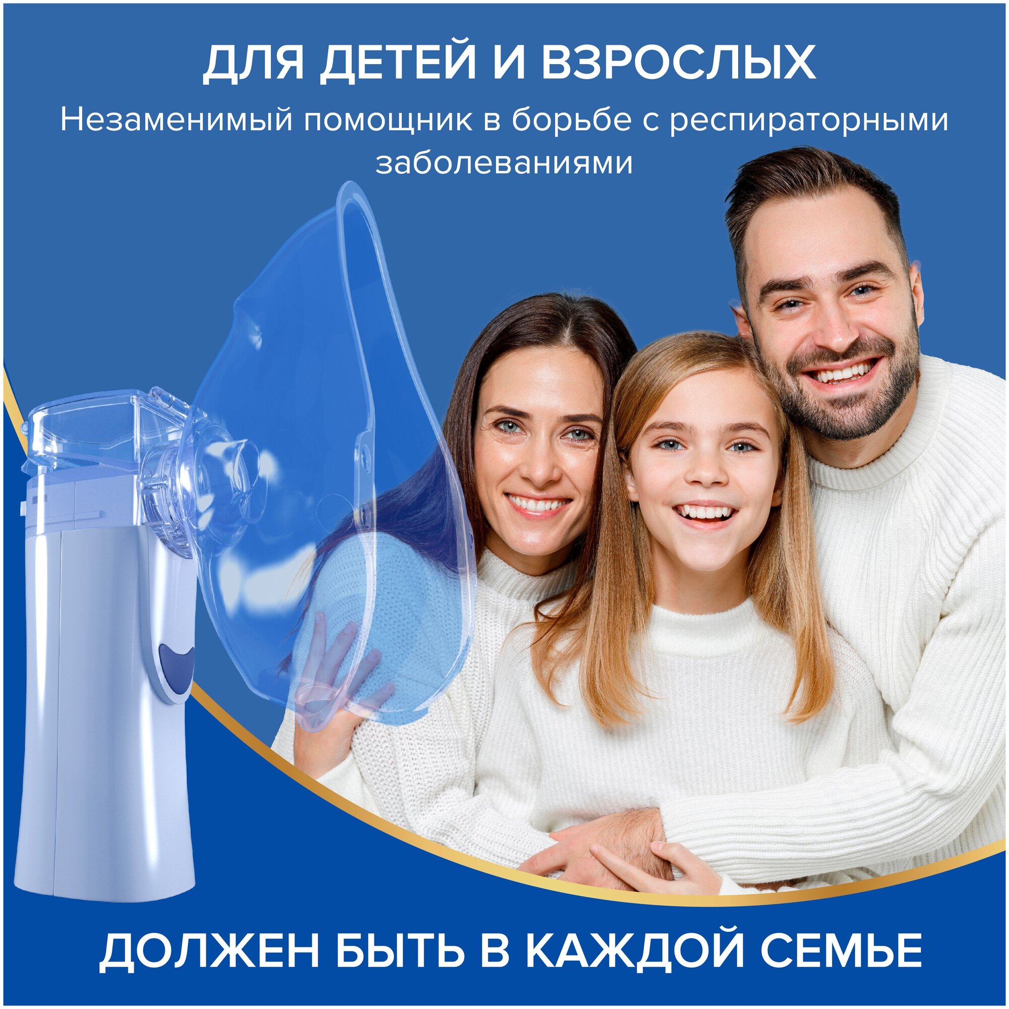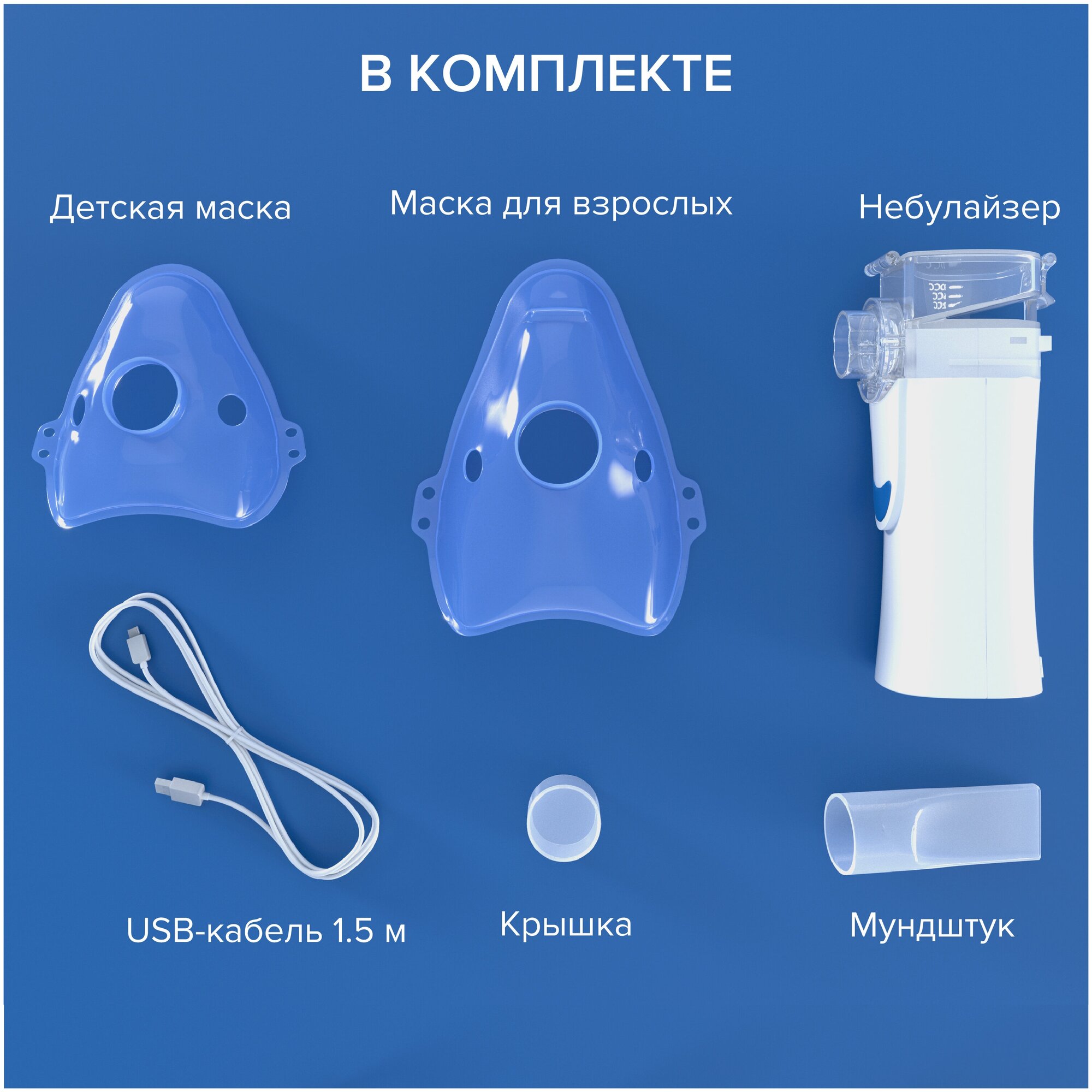 Покупала небулайзер для профилактики по совету врача. Сам по себе он небольшой и очень легкий. В комплекте идут взрослая маска, детская маска, мундштук и usb-провод.