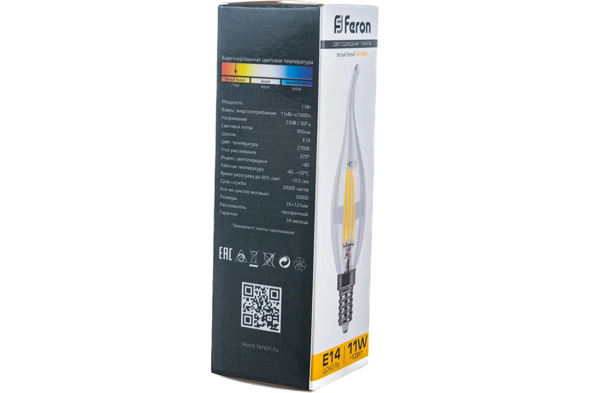 Купить Лампа светодиодная филаментная Feron E14 11W 2700K Свеча на ветру Прозрачная LB-714 38010