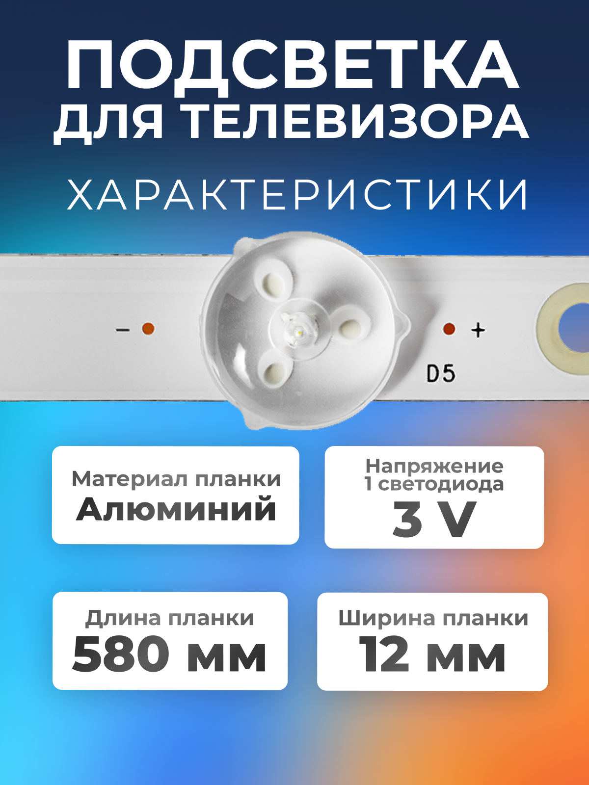 | Дополнительная информация | Длина планки 580mm , количество светодиодов на планке 6 led , коннектор подключения подсветки 3 pin , напряжение светодиодов 3V , тип рассеивателя YX-TV-18-0D25-1A (пуговка) |