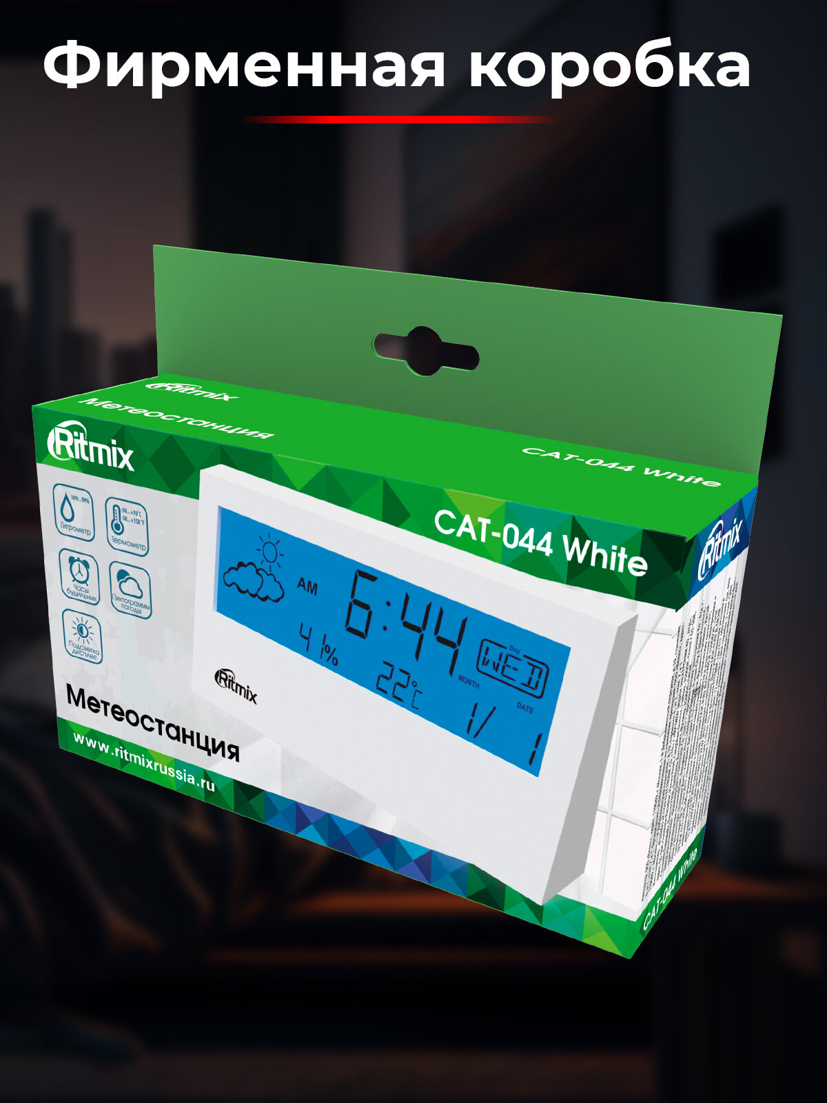 Метеостанция RITMIX CAT-044, комнатная, термометр, гигрометр, будильник, 2хААА, белая