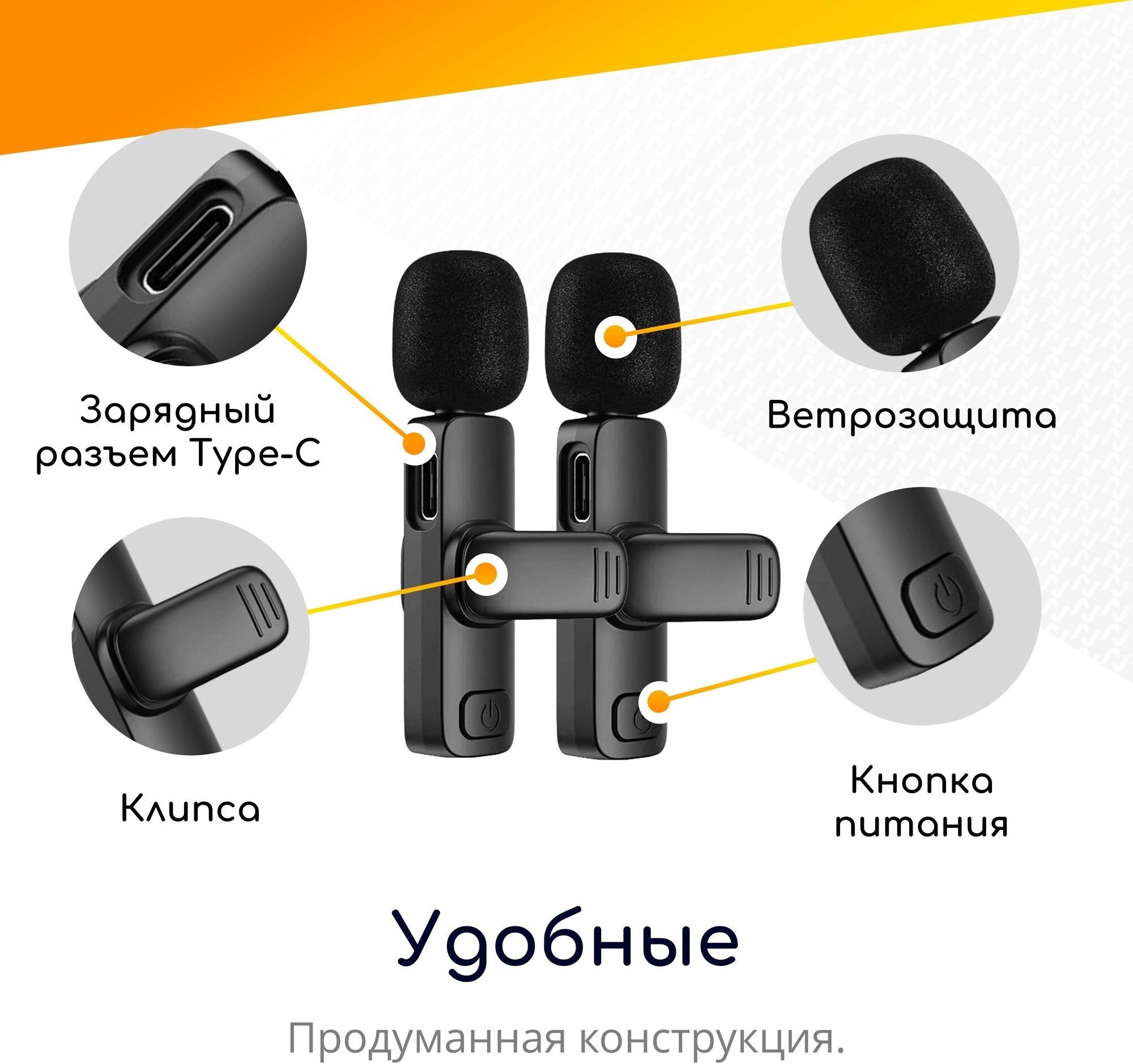 Микрофон петличный беспроводной, с шумоподавлением, петличка, для мобильного телефона, разъем Lightning, для Iphone, черный, 2шт