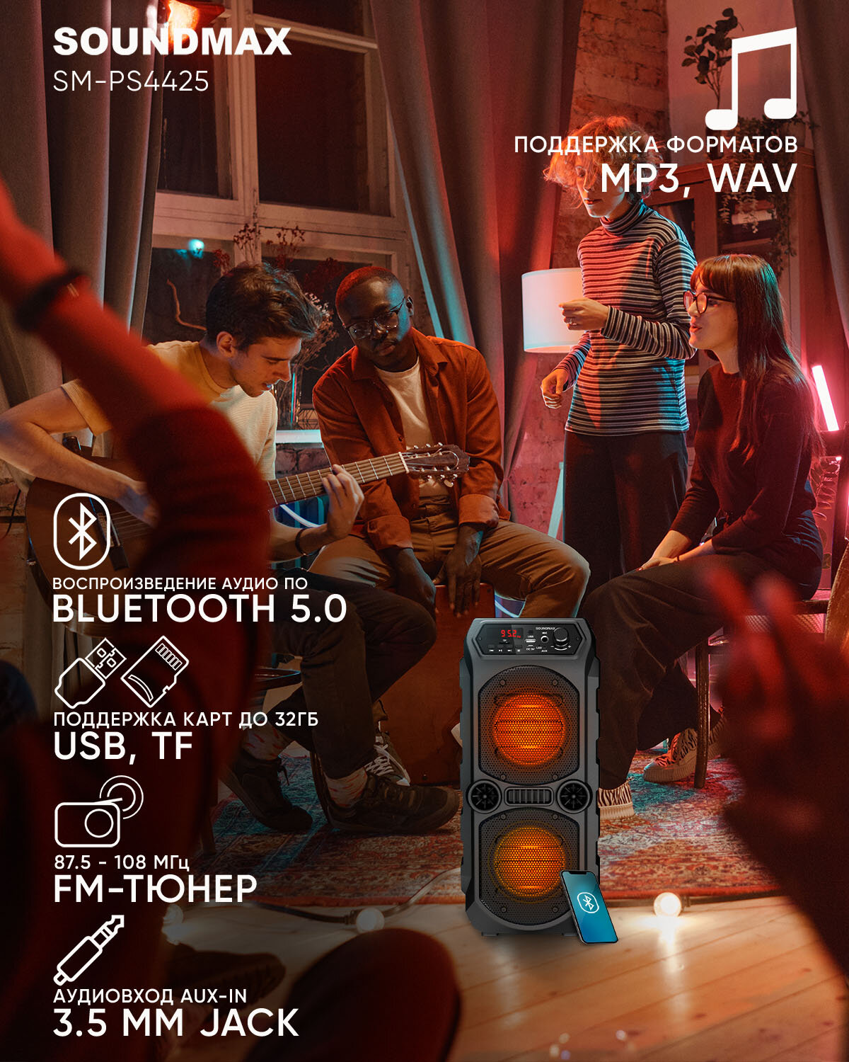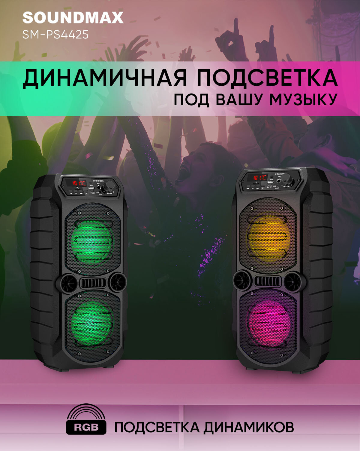 SOUNDMAX Портативная караоке система Soundmax SM-PS4425, 30 Вт, 1200 мАч, BT,SD, AUX, USB,подсветка