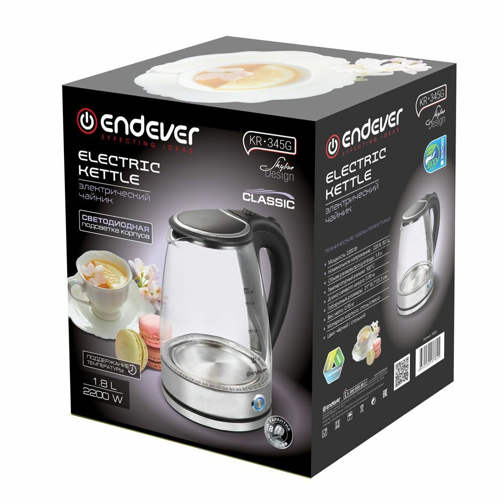 Чайник электрический ENDEVER Skyline KR-345G, steel/black (Мощность 2200 Вт, объем 1,8 л) (90263)