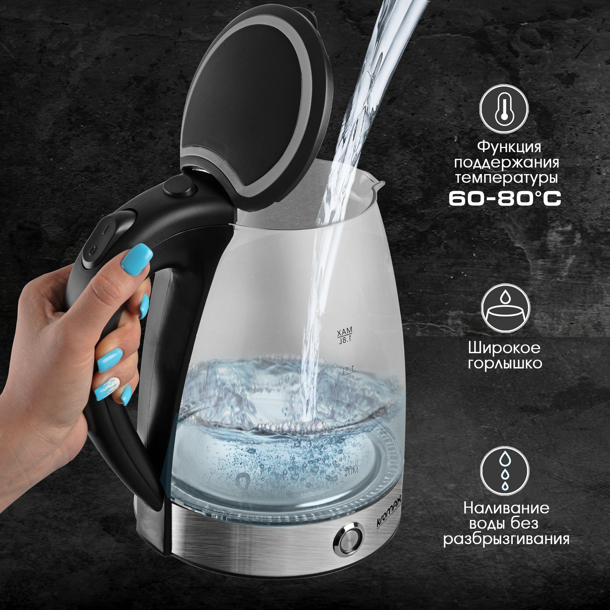 | Дополнительная информация | Температурный режим: 100°С, Кнопка поддержания температуры: 60-95 °C, Беспроводное соединение позволяет вращать чайник на подставке на 360°, Световой индикатор включения, Автоотключение при отсутствии воды, Автоотключение при закипании, Защита от перегрева, Светодиодная подсветка корпуса |
