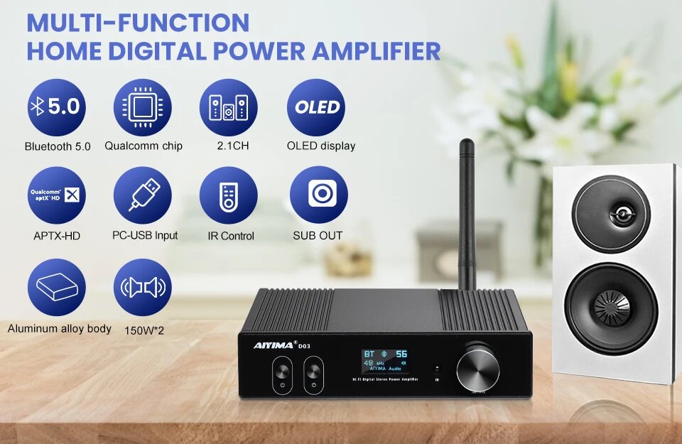 Купить 2.1 усилитель для колонок AIYIMA D03 Bluetooth 150 Вт с ЦАП + блок питания
