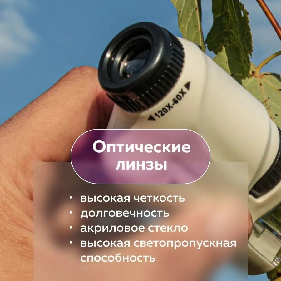 Понравилось что микроскоп имеет компактный дизайн и легко помещается в кармане, что делает его удобным для использования в любом месте. Довольна покупкой и рекомендую ее всем, кто хочет узнать больше о мире вокруг нас.