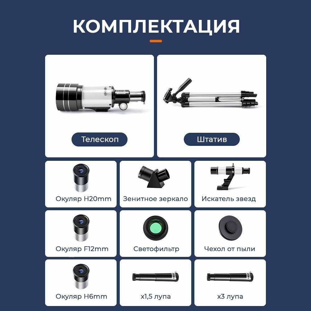 | Комплектация | Оптическая труба; Держатель трубы; Штатив; Окуляры; Барлоу-линза. |