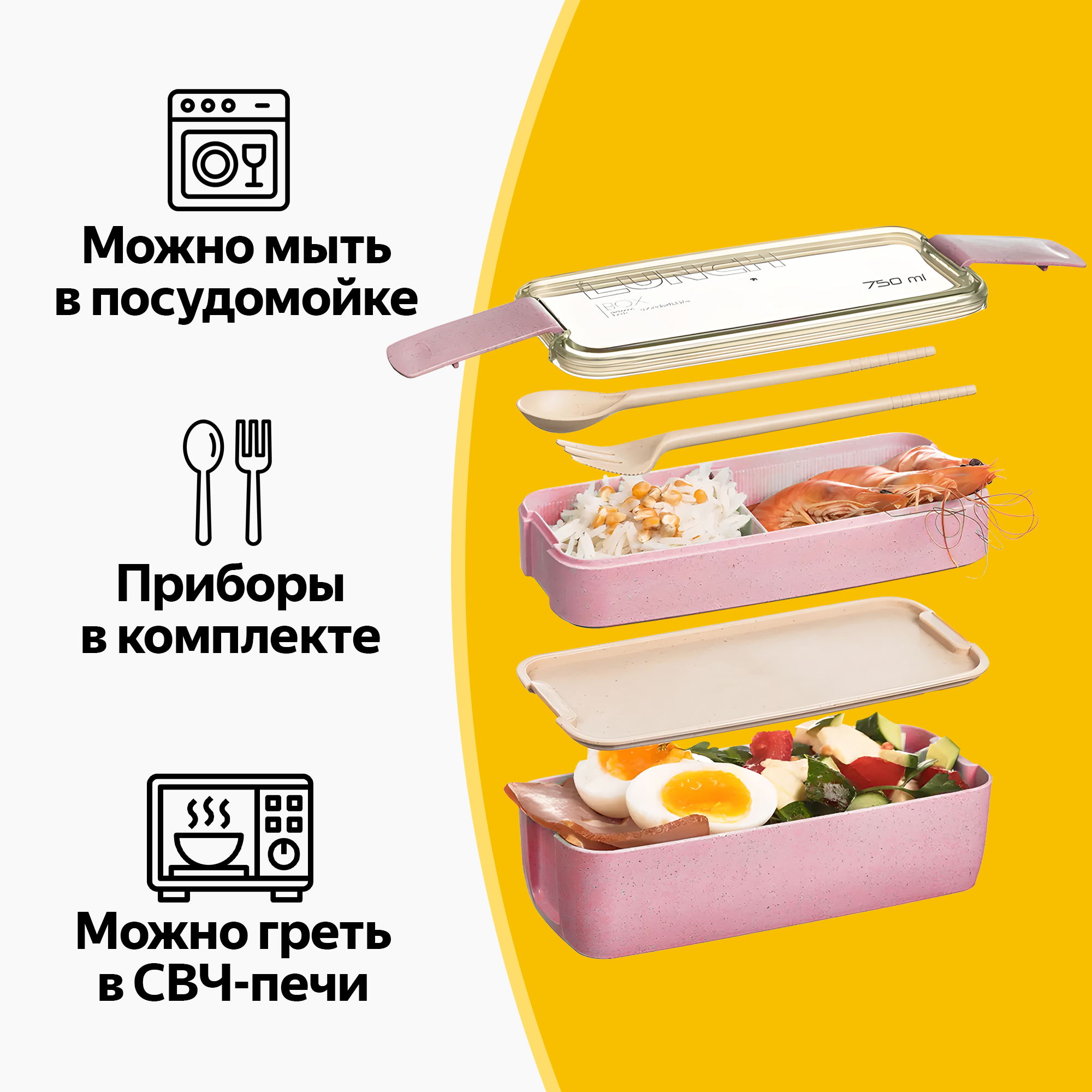 Купила себе этот ланч-бокс. понравился цвет приятный розовый и емкость 750мл. достаточная. Беру с собой на работу, удобно пользоваться. Две секции, продукты хранить комфортно. Материал безопасный пищевой пластик, без запахов. Очень довольна.