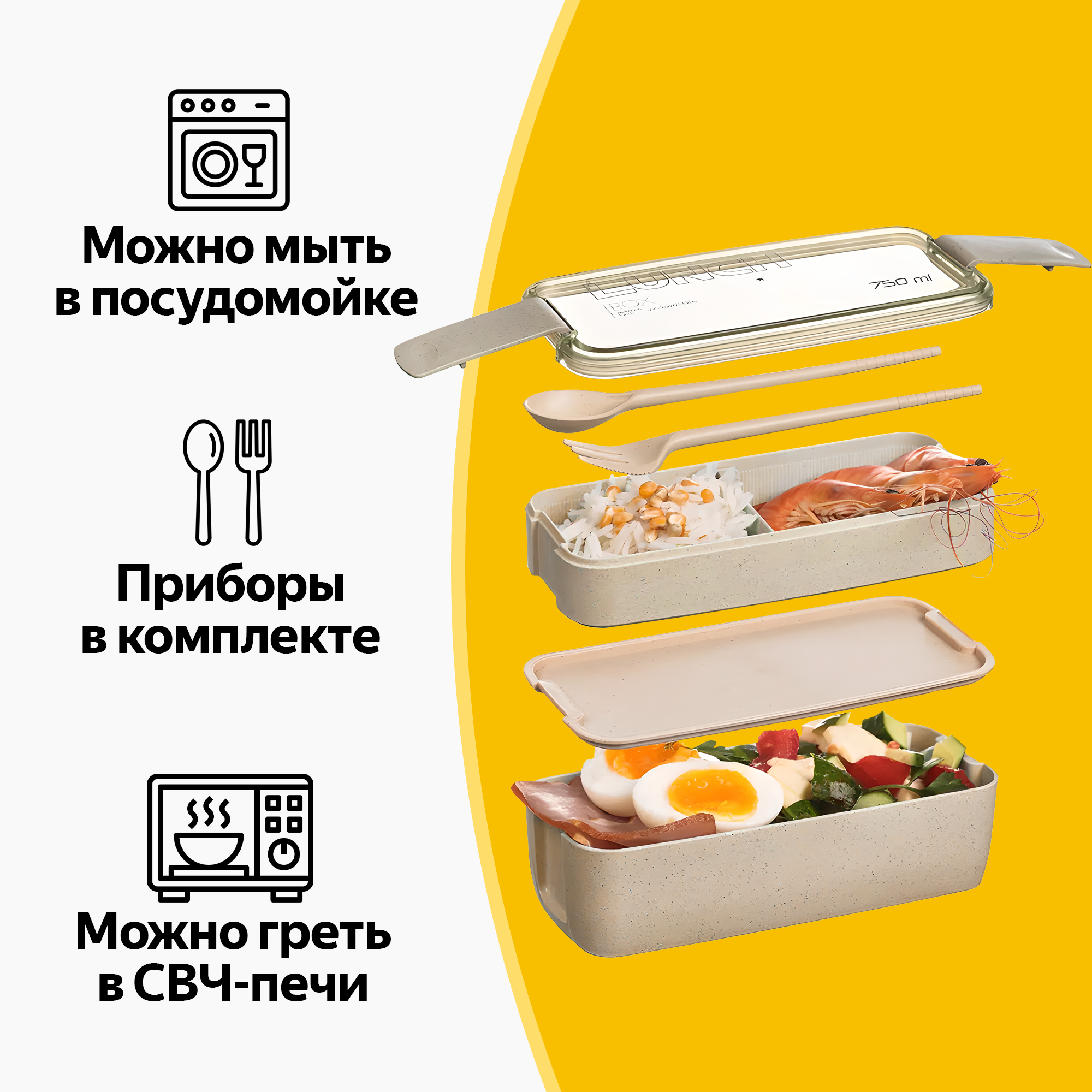 Купить Контейнер пластиковый для еды (ланч-бокс), 750 мл, со столовыми приборами, в дорогу, школу или на работу, бежевый