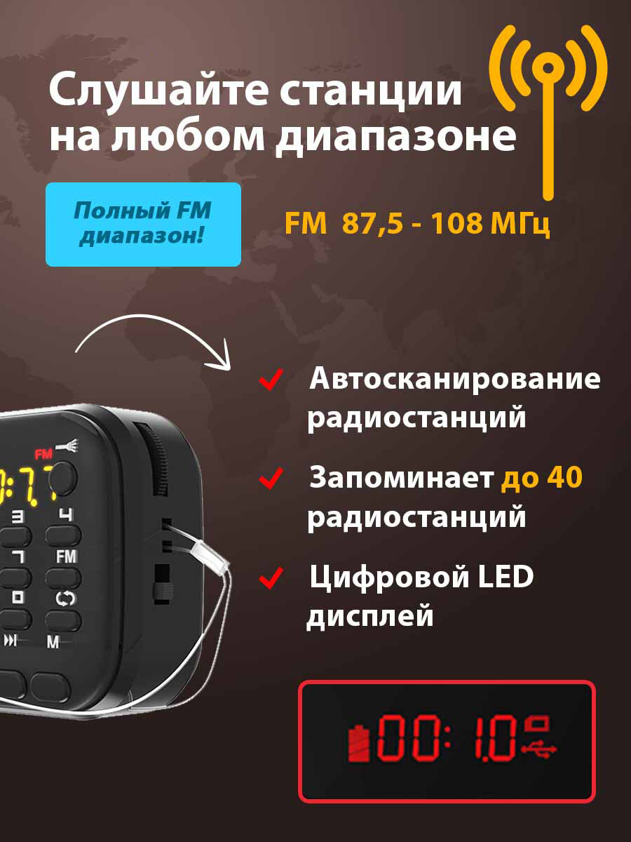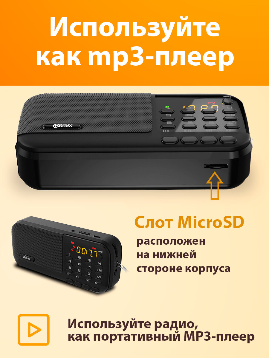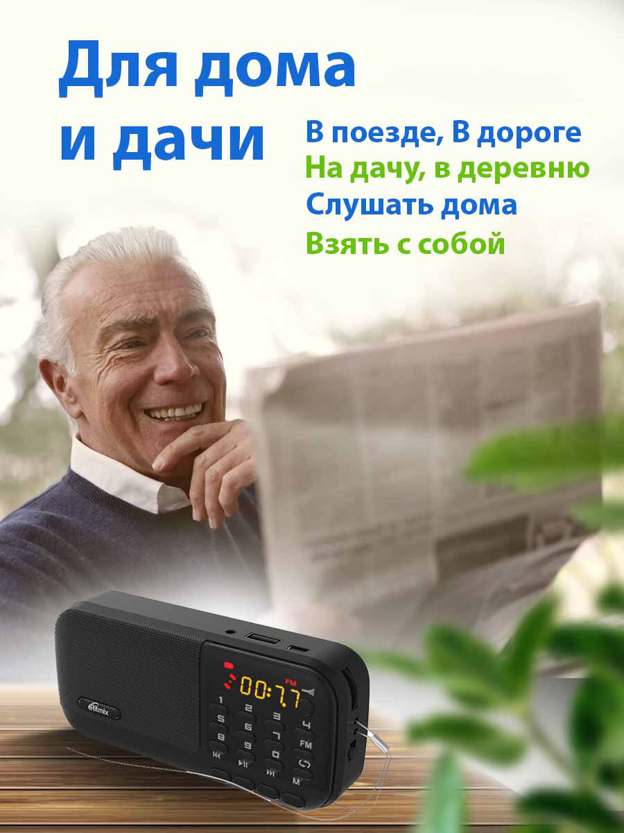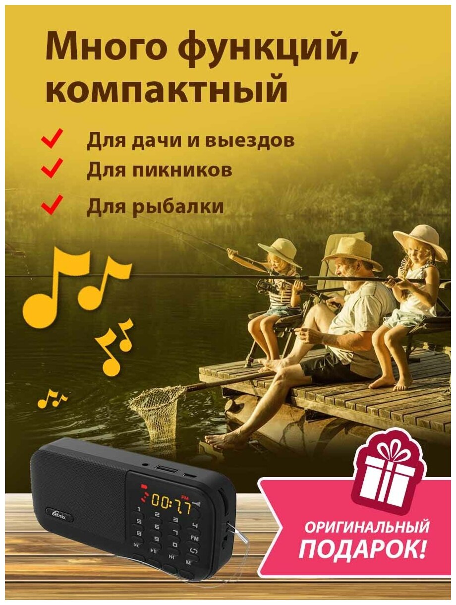 Радиоприемник Ritmix RPR-007 usb, microSD,87,5-108 МГц , встроеный акумулятор,фонарик интересное:
