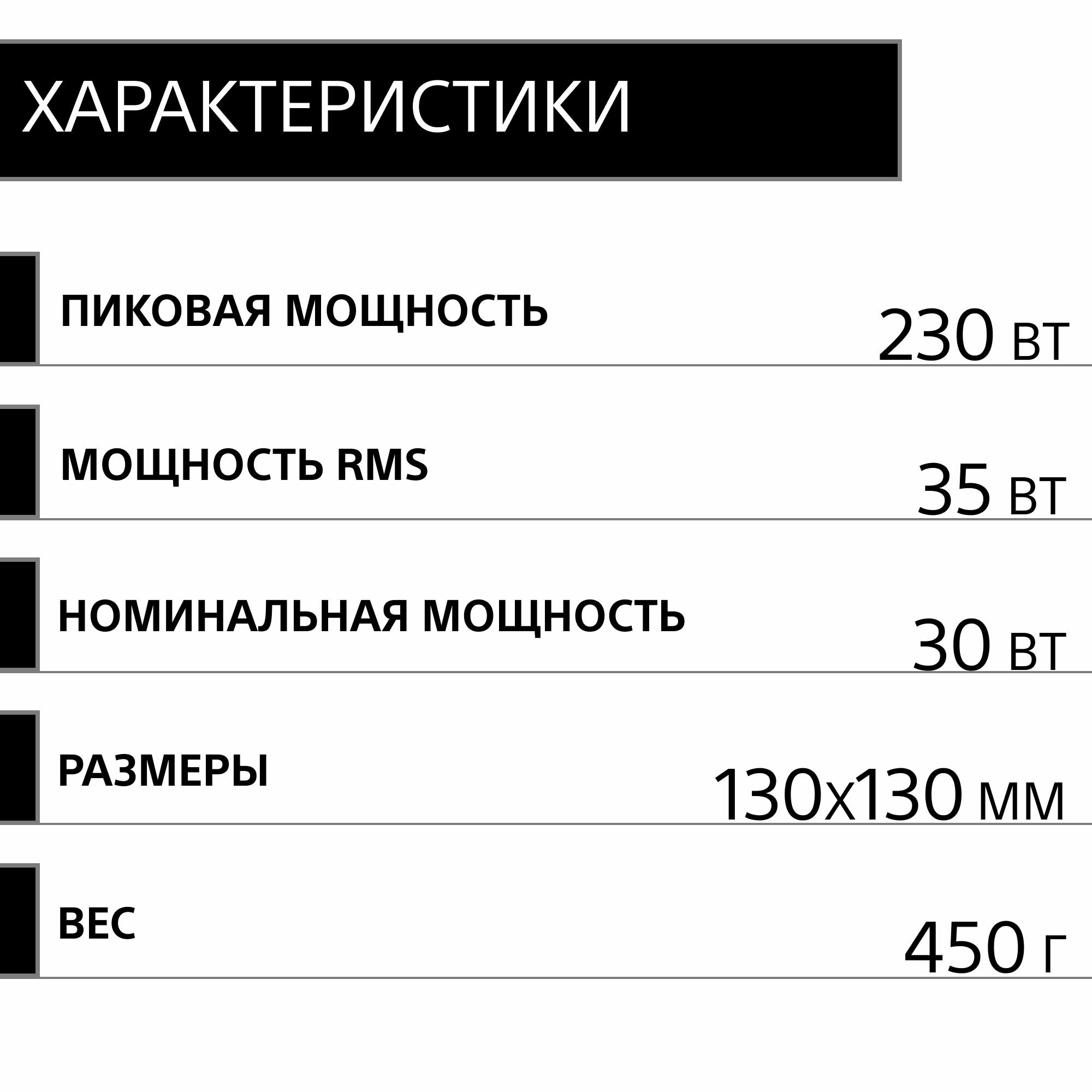 | Мощность | 30 Вт (номинальная), 230 Вт (максимальная) |