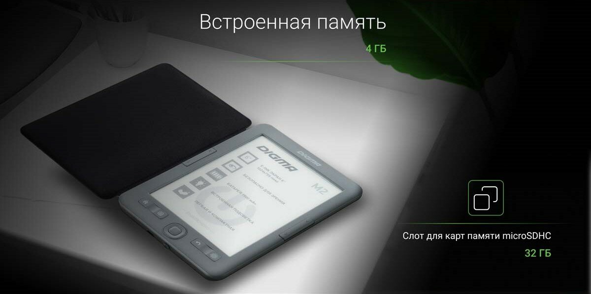 Купить Электронная книга Digma M2 6" E-ink HD 758x1024 600MHz 128Mb/4Gb/SD/microSDHC/подсветка дисплея темно-серый (в компл.:обложка)