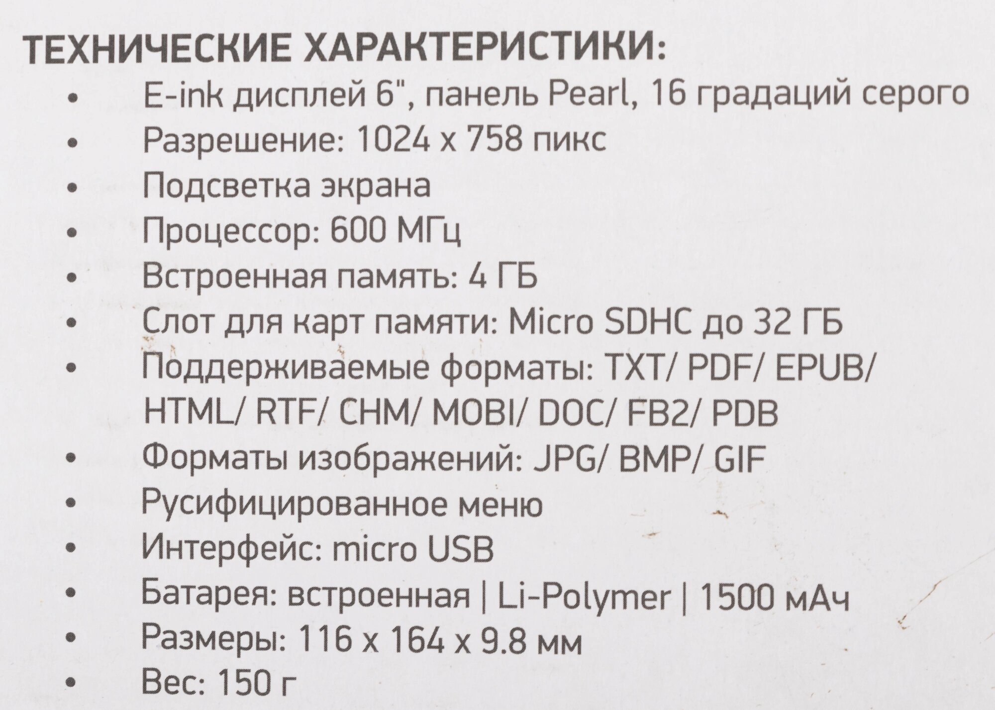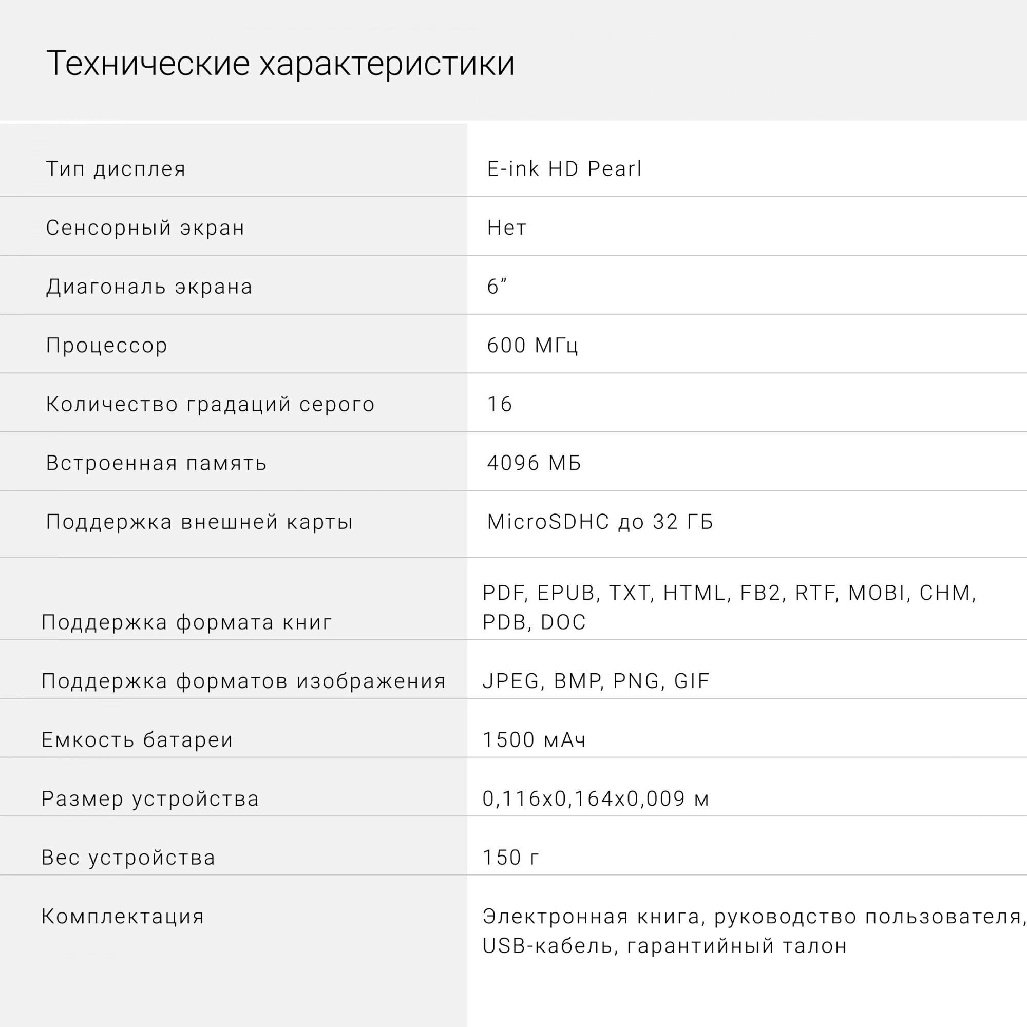 | Тип дисплея | E-Ink |